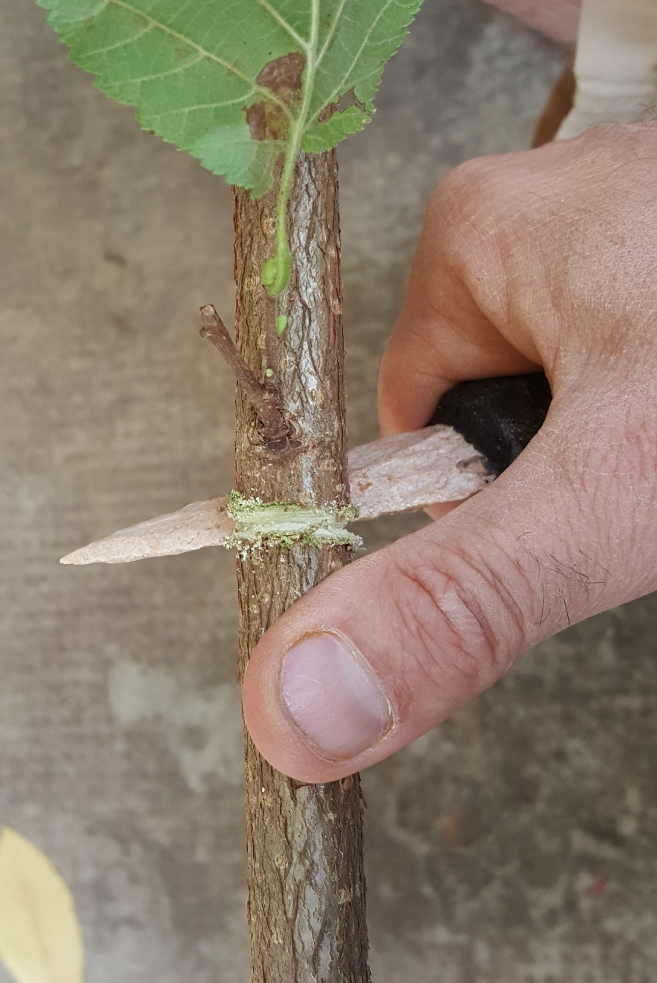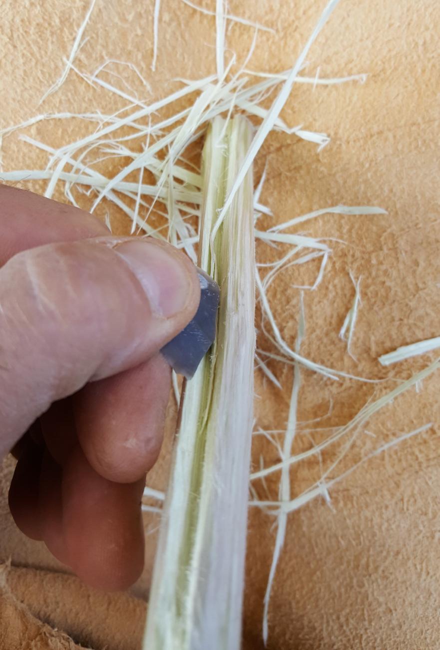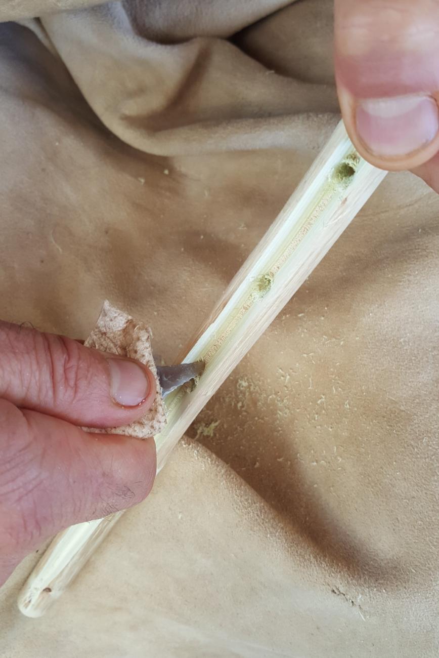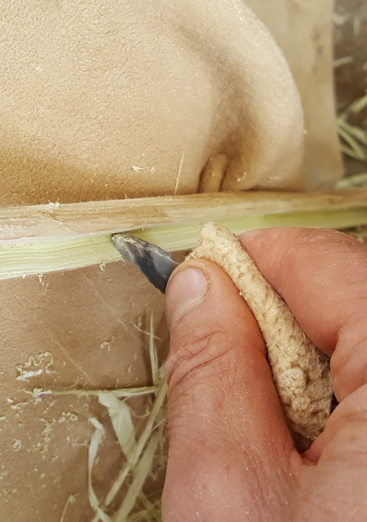 It indicates that this end was cut where a first thin side shoot usually branches off. Such a sapling can be easily notched and broken off with the flint knife. Clean debarking is done with the small blade. Since fresh wood is easier to work with than dried wood, it was decided to put the groove in immediately but let the stick dry prior to drilling the holes.