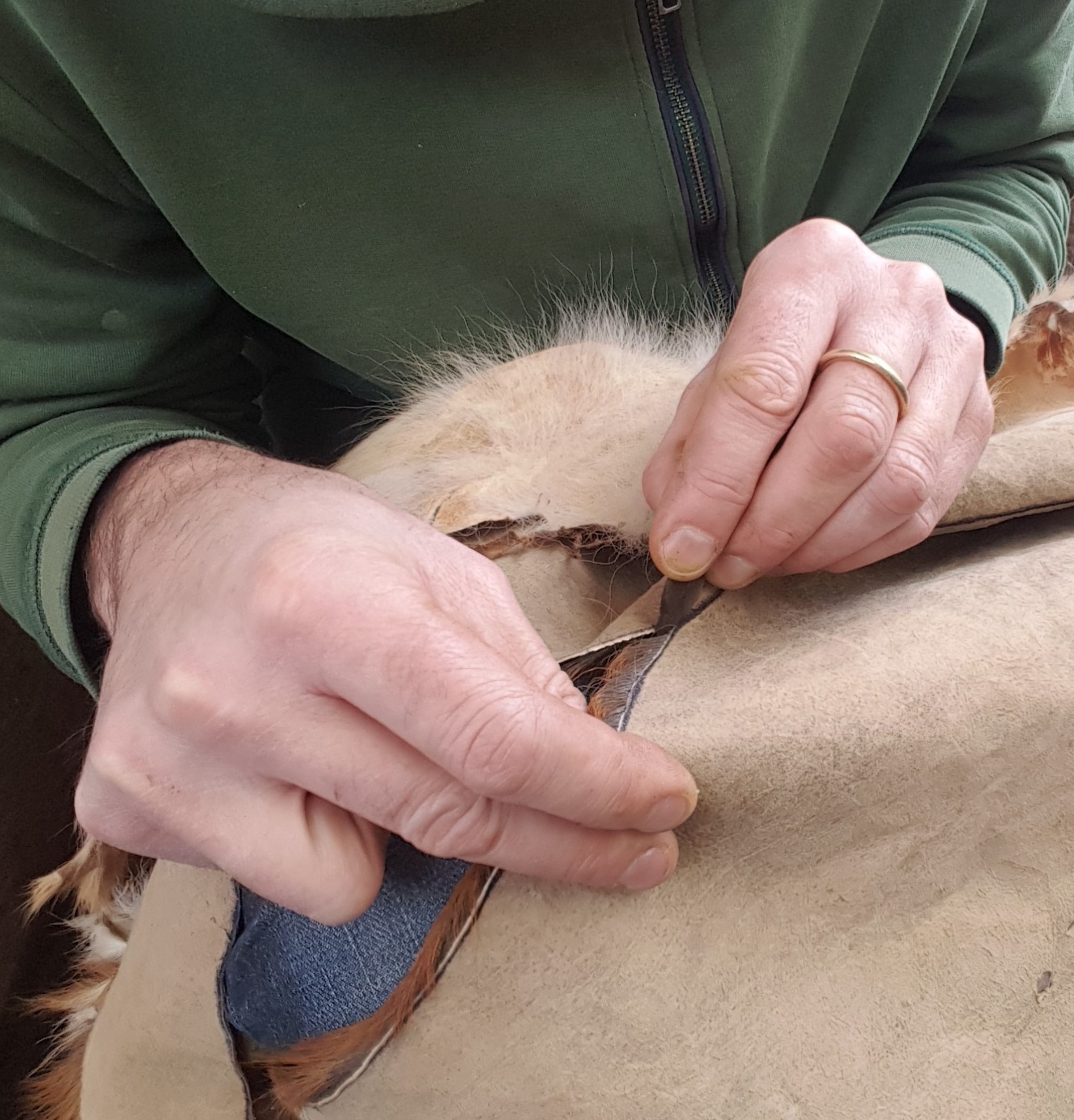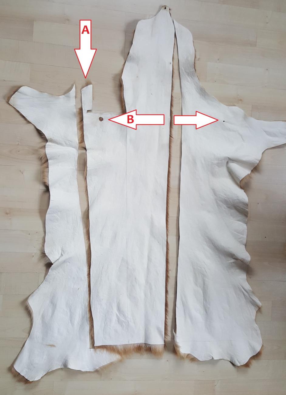 First tests in a tannery with more than a dozen roe deer skins showed that none was long enough to place the pattern as shown by Spindler and Egg (2009). This may be due to the fact that around 50% of roe deer shot in German-speaking countries areyoung (Ophoven, 2005, p.18). Another factor is that the neck area of commercially tanned hide usually only remains partially intact. It can therefore be assumed that the Iceman must have used the skin of a large, adult deer, presumably that of a buck.