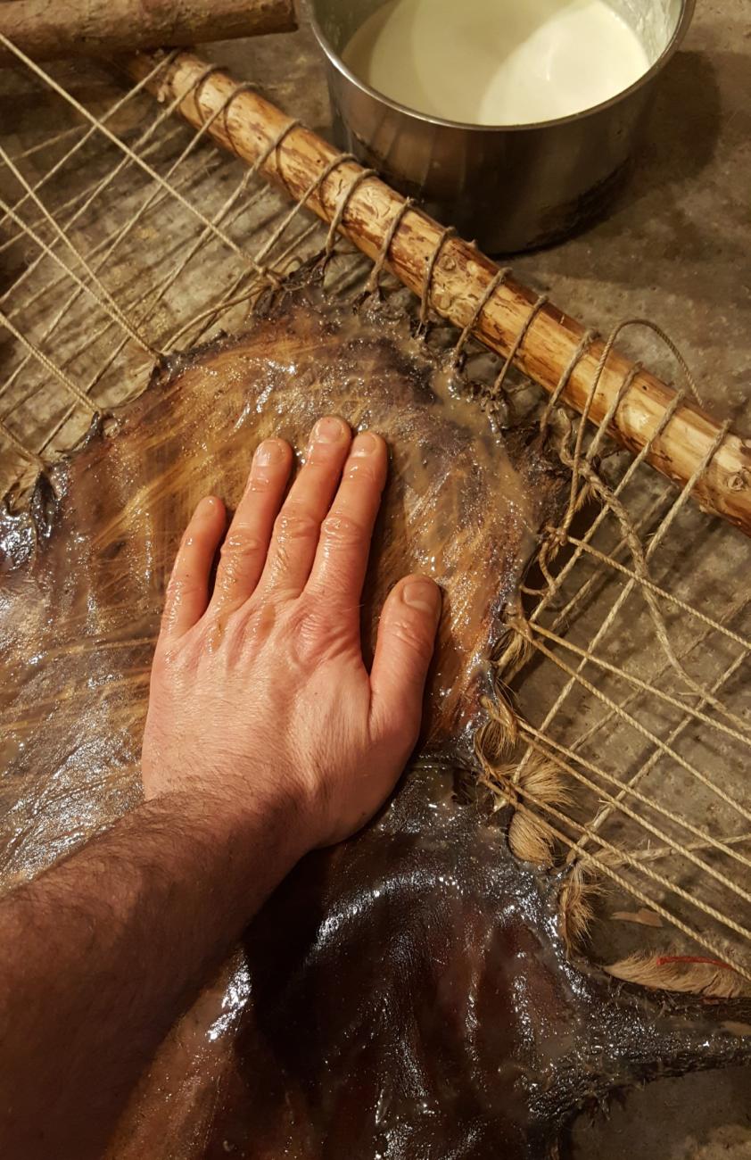 A type of combination tanning was used for the treatment, which appeared plausible according to the above analyses. After fleshing, the skin was soaked in oak bark brew for eight days. After lashing into the frame, an aqueous grease solution was worked in several times. This consisted of a mixture of sheep brains with some linseed oil. Subsequent smoking completed the process (See Figure 8).