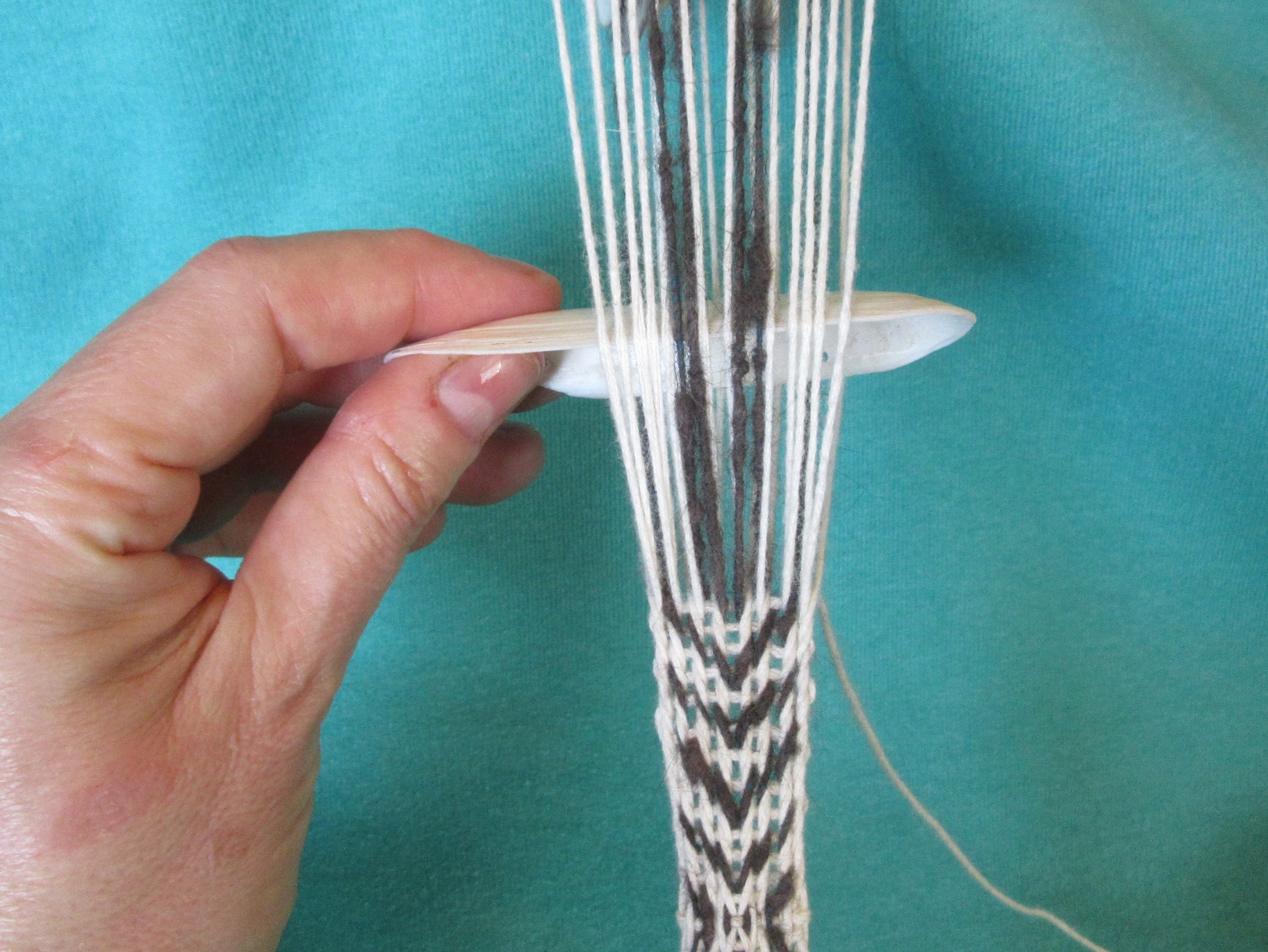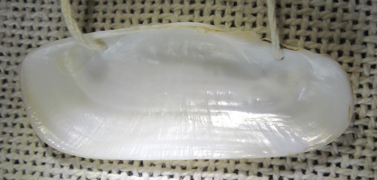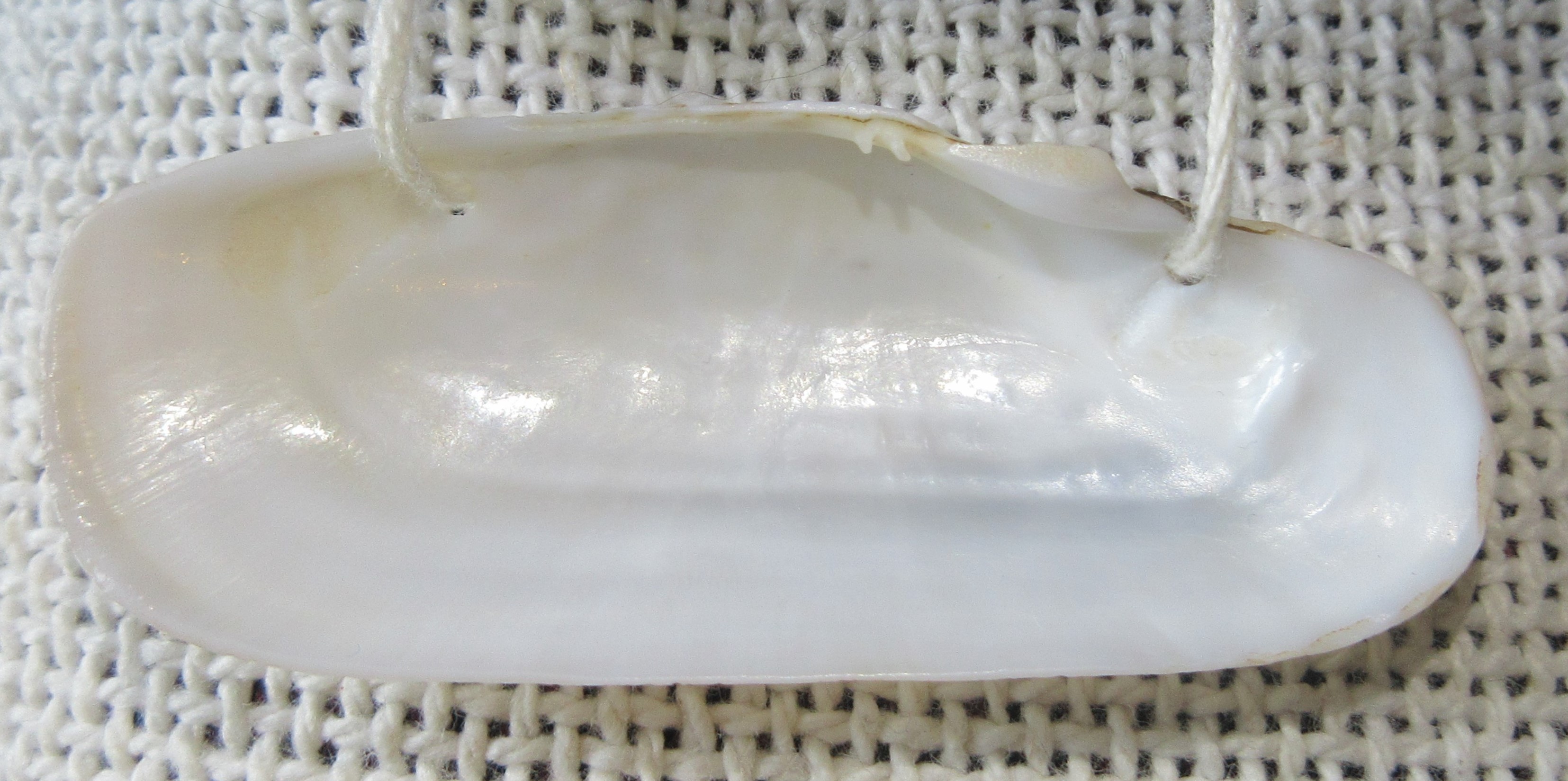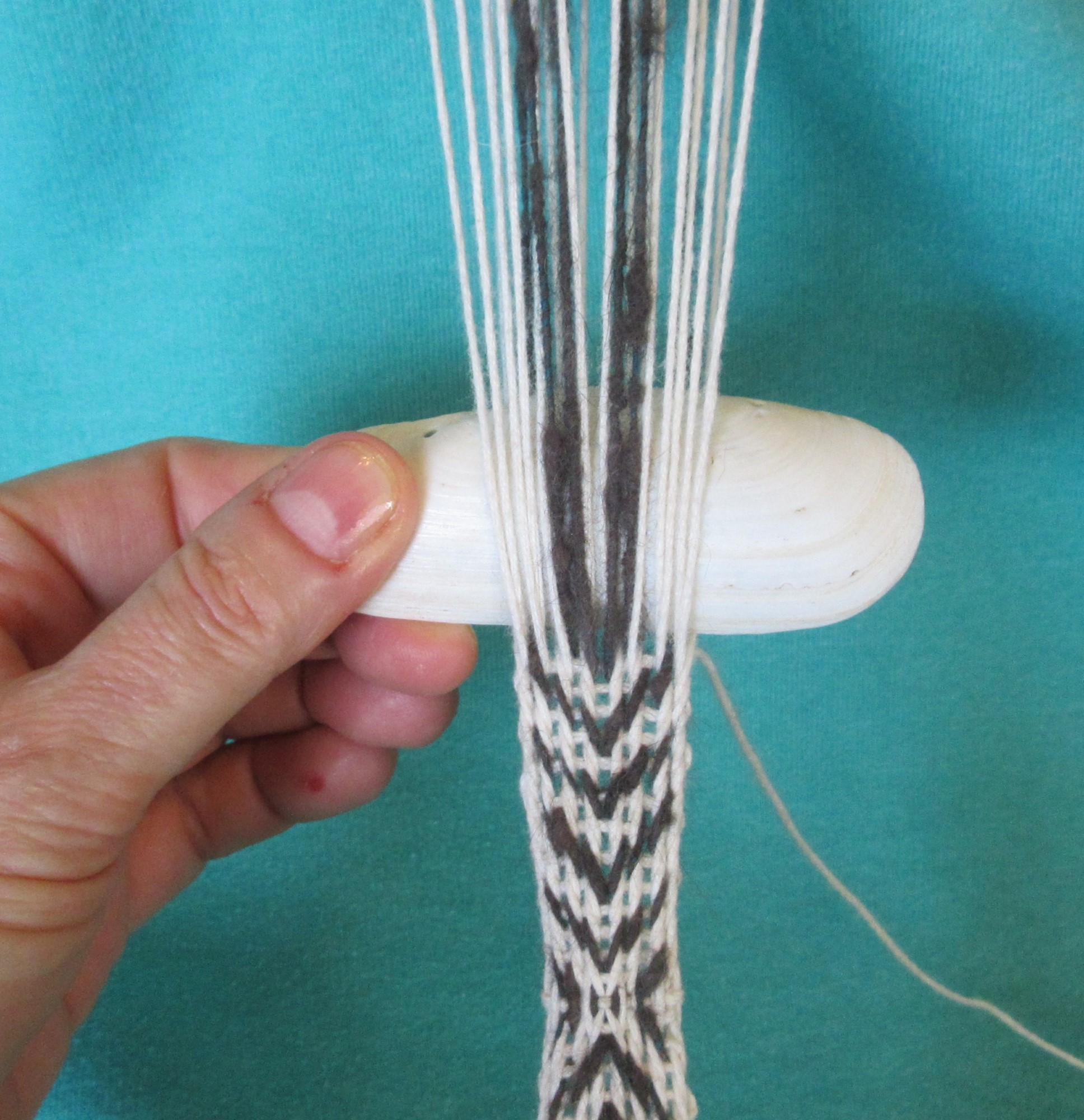 Both the naturally smooth Tagelus shells and the modified Tagelus shells worked well as small battens for weaving this band of cloth. The concave shape of the shell provided a secure grip for the weaver, while the thin bottom edge of the shell was effective for packing the weft and tightening the weave (See Figure 16. Tagelus shell batten, packing the weft). Turning the shell perpendicular to the warp efficiently opened the shed to allow easier passage of the weft (See Figure 17. Tagelus shell batten, opening the shed). Both modified and unmodified shells were also strong enough to withstand sustained use without chipping or breaking.