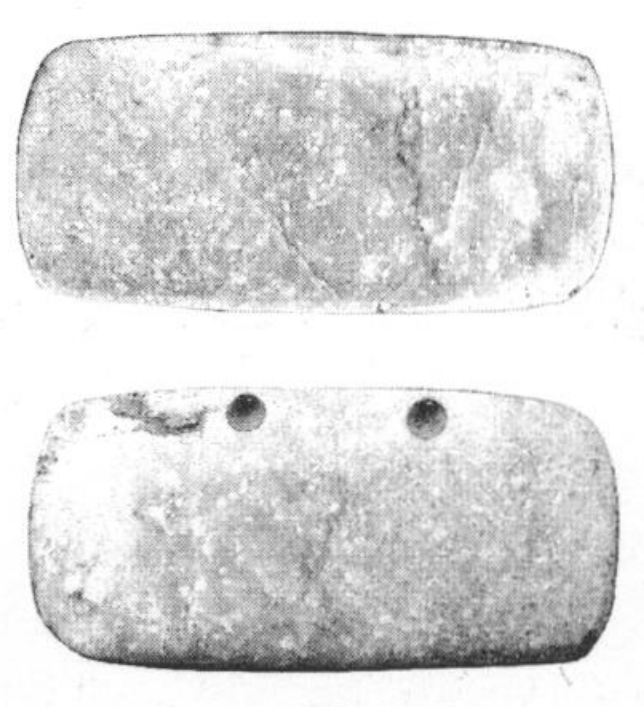 The next experiment tested whether or not Tagelus shells could easily be drilled with holes for suspension, so that the shell may be worn as a pectoral ornament in the same manner as shown on Olmec and Olmec-related sculptures. Most greenstone clam shell effigies have two biconical holes on the back of the effigy that were drilled through the thicker top or hinge area of the shell (See Figures 3 and 4); these holes are not drilled through the front of the shell, so when a suspension cord is strung through the holes, the cord is not visible on the front. A subgroup of the greenstone effigies has two holes drilled through the shell just under the hinge; when the sculpted hinge is heavy enough, the horizontal length of cord strung through these holes would be hidden under the hinge (Gann, 1918, p.91 and Plate 16); the cord may also be threaded through the holes on the front so that the horizontal length of the cord is hidden on the back. In all of these cases, the holes are placed evenly on the shell, between 1/4 to 1/3 of the shell length from each end of the shell. This allows the shell to be suspended so that it hangs evenly in a horizontal manner.8