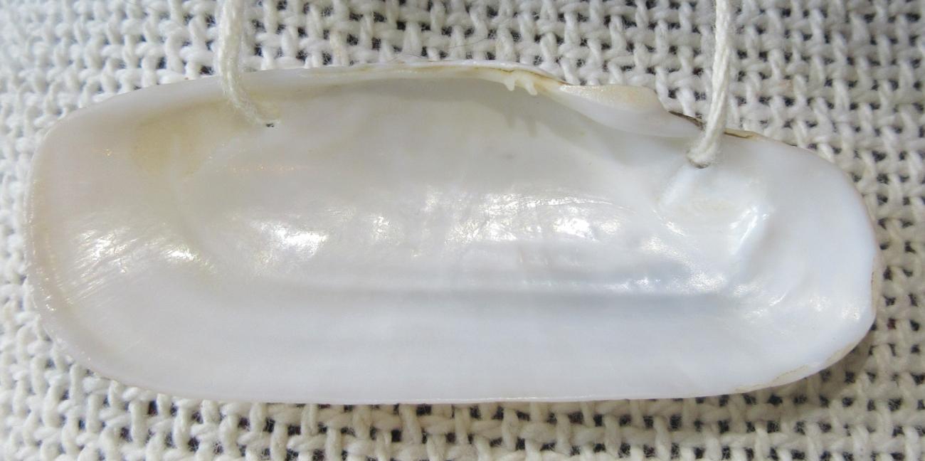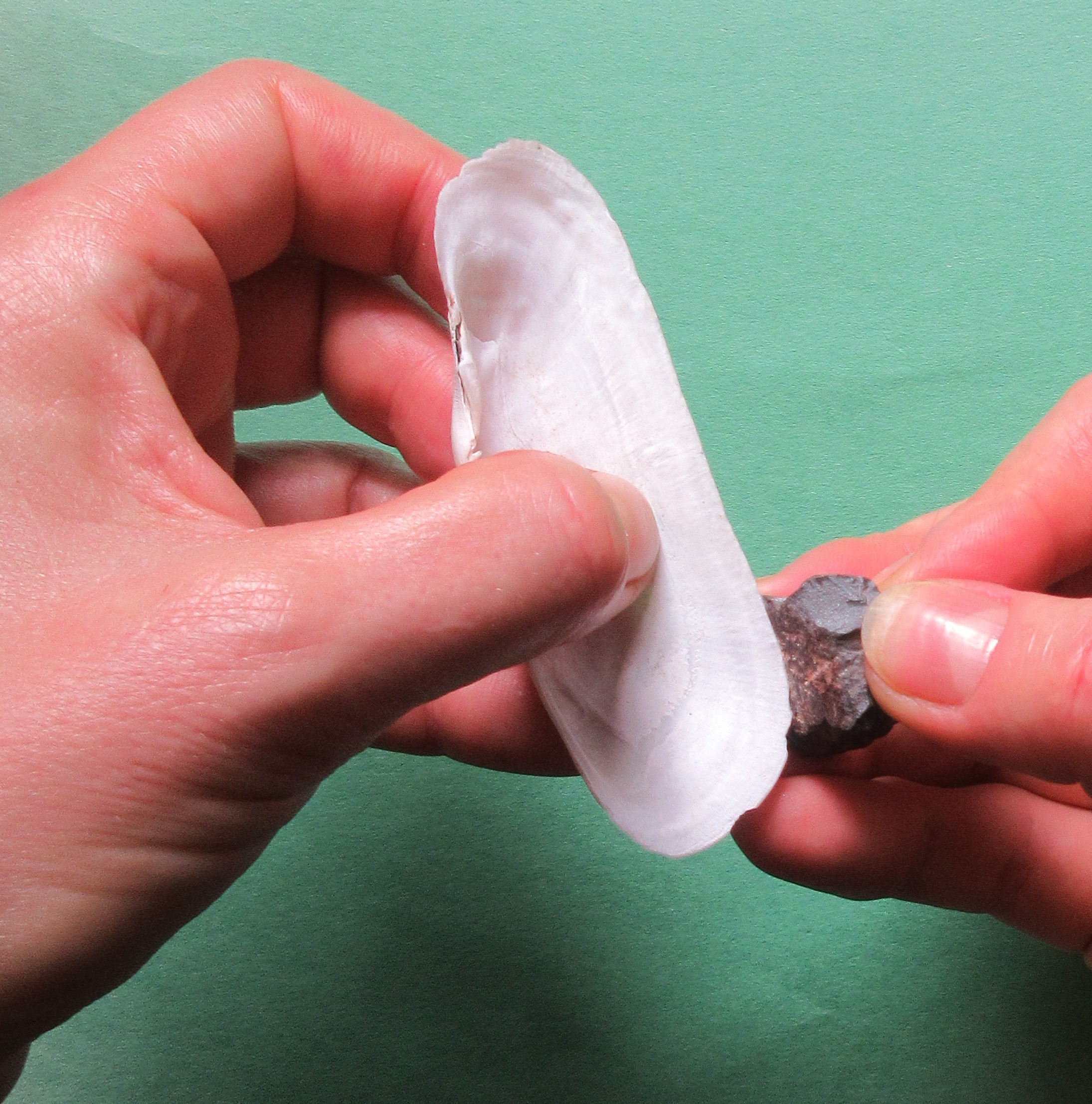 As Tagelus shells have relatively narrow, thin hinges, drilling two biconical holes as shown on the greenstone effigies is not effective physically or aesthetically. Biconical drilling creates four holes through the back of the shell, with at least two of the holes lower on the body of the shell and therefore visible on the front/interior of the shell; in addition, the tiny shell bridge between each set of these holes is particularly fragile and prone to breakage. The most effective way to suspend Tagelus shells as horizontal pectorals, therefore, is to drill two holes through the shell near the top hinge, as in the subgroup of greenstone shell effigies. As on the effigies, the most effective placement of the holes on a Tagelus shell for even, horizontal suspension is about one-quarter of the length from each end of the shell and just under the hinge. Since Tagelus shells have thinner areas of muscle scars in these two locations, this placement is convenient for relatively easy drilling; holes placed in these positions also have extra support on the inner edges by adjacent, thicker parts of the shell and at the top by the hinge. In this replication studies experiment, a flint dart projectile point, drill, or pointed flake was found to effectively and efficiently drill holes through the muscle scars of Tagelus shells, typically in less than five minutes for each hole (see Figure 15. Drilling suspension holes in a Tagelus shell). When a cord is threaded through the front holes of the shell, this hole configuration not only provides extra support exactly in the areas where the cord creates stress, but also allows for a balanced suspension of the shell, and the horizontal length of the suspension cord between the holes is hidden behind the shell (See Figure 14).