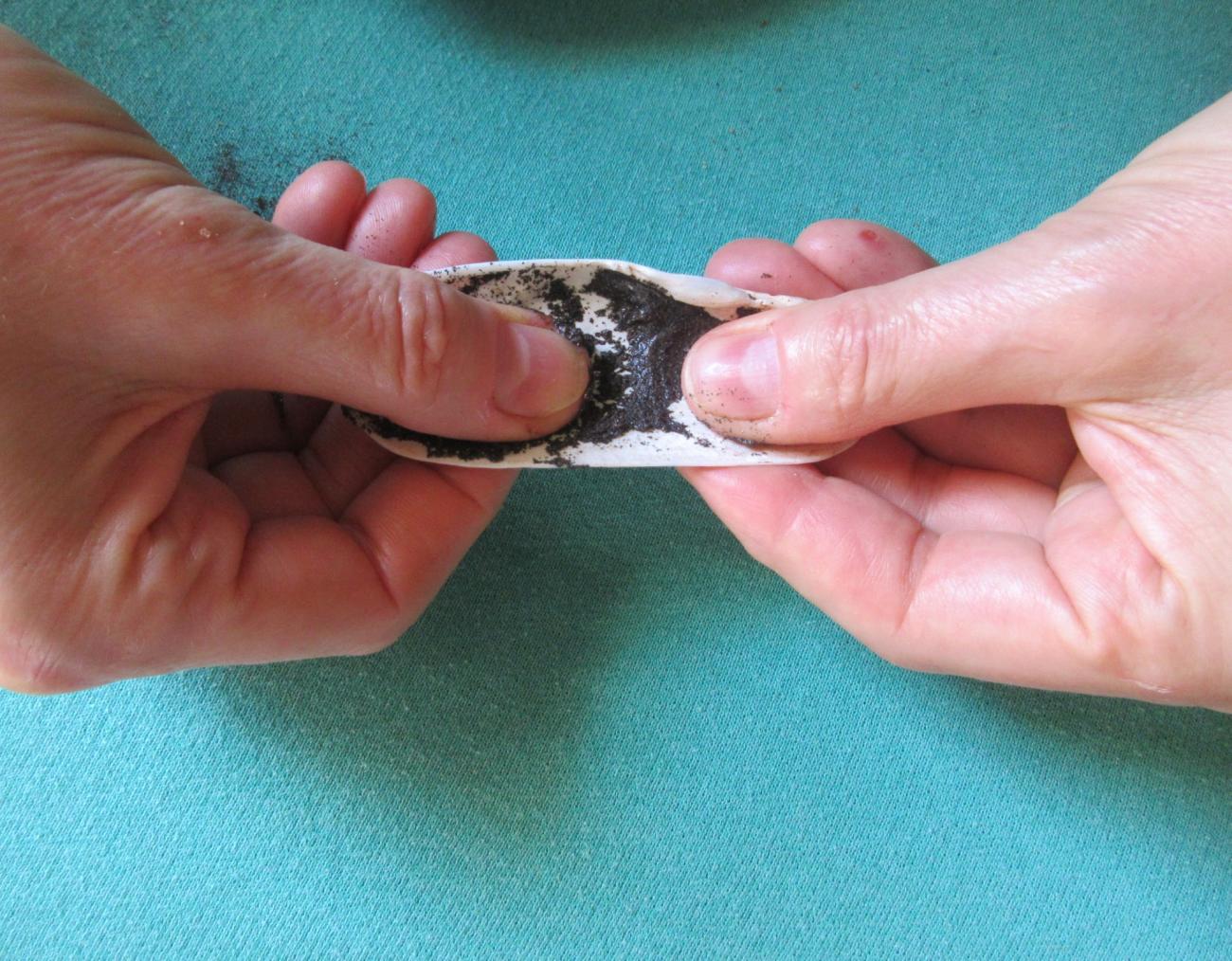 Next, to refine these reshaped silhouettes, granular iron ore was placed on top of a flat surface – in this case, a piece of wooden board – and moistened, and the shell was placed interior side-down on top of the iron ore. Moving the shell in back and forth and in circular motions served to further even out the perimeter of the shell as well as to bevel the edges to their original fineness (See Figure 10. Beveling a Tagelus shell). Likewise, experiments in polishing the matte white Tagelus shells were surprisingly effective, as the appearance of these shells changes markedly with little effort. Fifteen to 30 minutes of rubbing a Tagelus shell just with bare fingers transforms the chalky white interior to a smooth, satin finish. Further gentle polishing of the interior of the shell for 30 minutes to an hour with granular iron ore and saliva (which is less slippery than water) reveals a hard, glossy interior surface; additional polishing on the exterior smooths the shell and creates translucency (See Figure 11. Polishing a Tagelus shell; see Figure 12. Unpolished, satin-polished, and fully polished Tagelus shells). All together, these experiments in reshaping, beveling, and polishing Tagelus shells were very quick and effective, resulting in a more conventionally attractive shell for display, with a glossy interior that matches the highly polished surfaces of the jade effigies and correlates well with depictions of concave oval, obround, and roundrect pectorals in Olmec and Olmec-related sculpture.