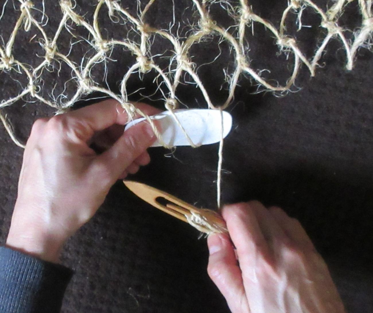 Finally, to test Tagelus shells as netting gauges, a four-foot wide net was started using 2 mm sisal twine, and a Tagelus shell was employed as a netting gauge. For each diamond-shaped mesh, the twine was wrapped around the shell, and the shell was used to regulate the size of the mesh while the knots were tied (See Figure 22. Tagelus shell used as a netting gauge). The Tagelus shells worked surprisingly well as netting gauges; the concave shape of the shell was easy to hold in place, and size range of the shells was ideal for holding, gauging, and stabilizing several loops of mesh at a time, while the smooth oval, obround, and roundrect shapes and the tapered shapes all allow the sisal twine loops to slide easily off the end of the shell as the mesh is progressively knotted down the row of netting. As in the other experiments conducted, both modified and unmodified Tagelus shells also proved strong and durable as netting gauges, withstanding sustained use with the sisal twine without chipping or breaking. The mesh netting produced in this experiment also corresponds well with depictions of mesh nets on Formative period Gulf Coast Olmec sculpture (See Figure 1c).