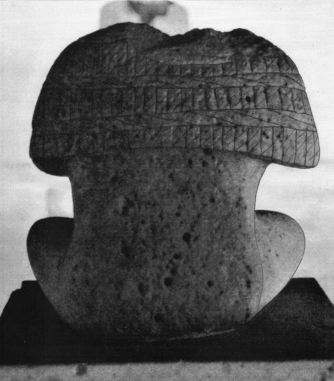 - 8In rare cases, a greenstone clam shell effigy may have a hole drilled through one end of the shell, in the middle, apparently so the effigy can be suspended vertically, as a pendant. This occurs on the two small clam shells recovered from the Sandstone Cist at La Venta in 1943, and these have been interpreted as spoons and as ear pendants (Stirling. 1943; Drucker et al., 1952, p.161). Otherwise, however, this unusual single suspension hole appears only on heavily reworked heirloom greenstone clam shells.