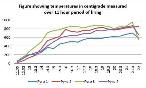 This firing took place at 11.35 on a warm, dry, and windless morning in July. This lasted for eleven hours until one of the four pyrometers had established that the temperature was at 954 degrees Centigrade at 21.30. However, it was not possible to increase the temperature beyond this point because the design of the firing chamber floor impeded the flow of gases around the kiln interior. At 21.30, stoking stopped, the entrance was blocked with old modern roof tiles, and the kiln fires were allowed to burn out.