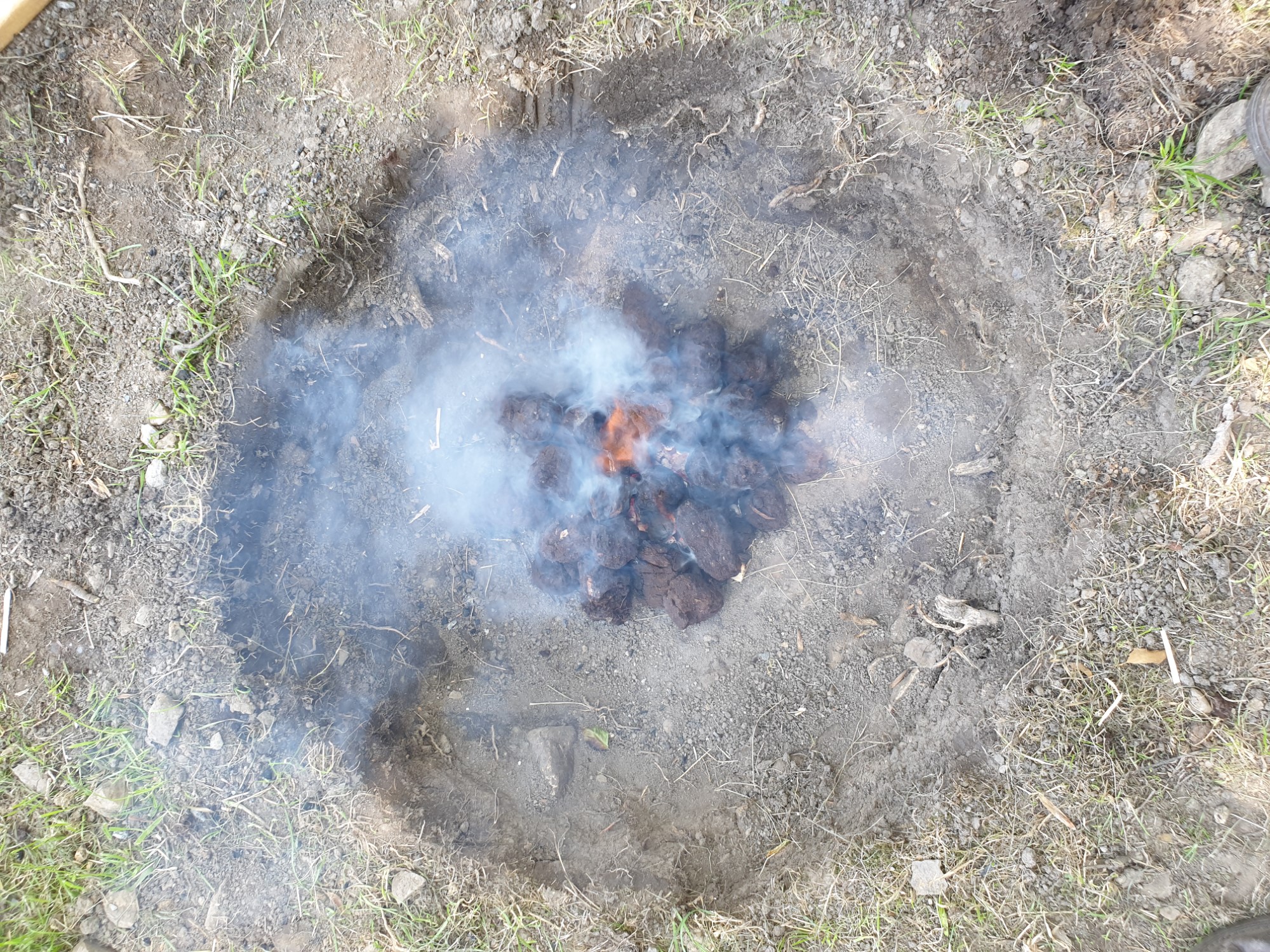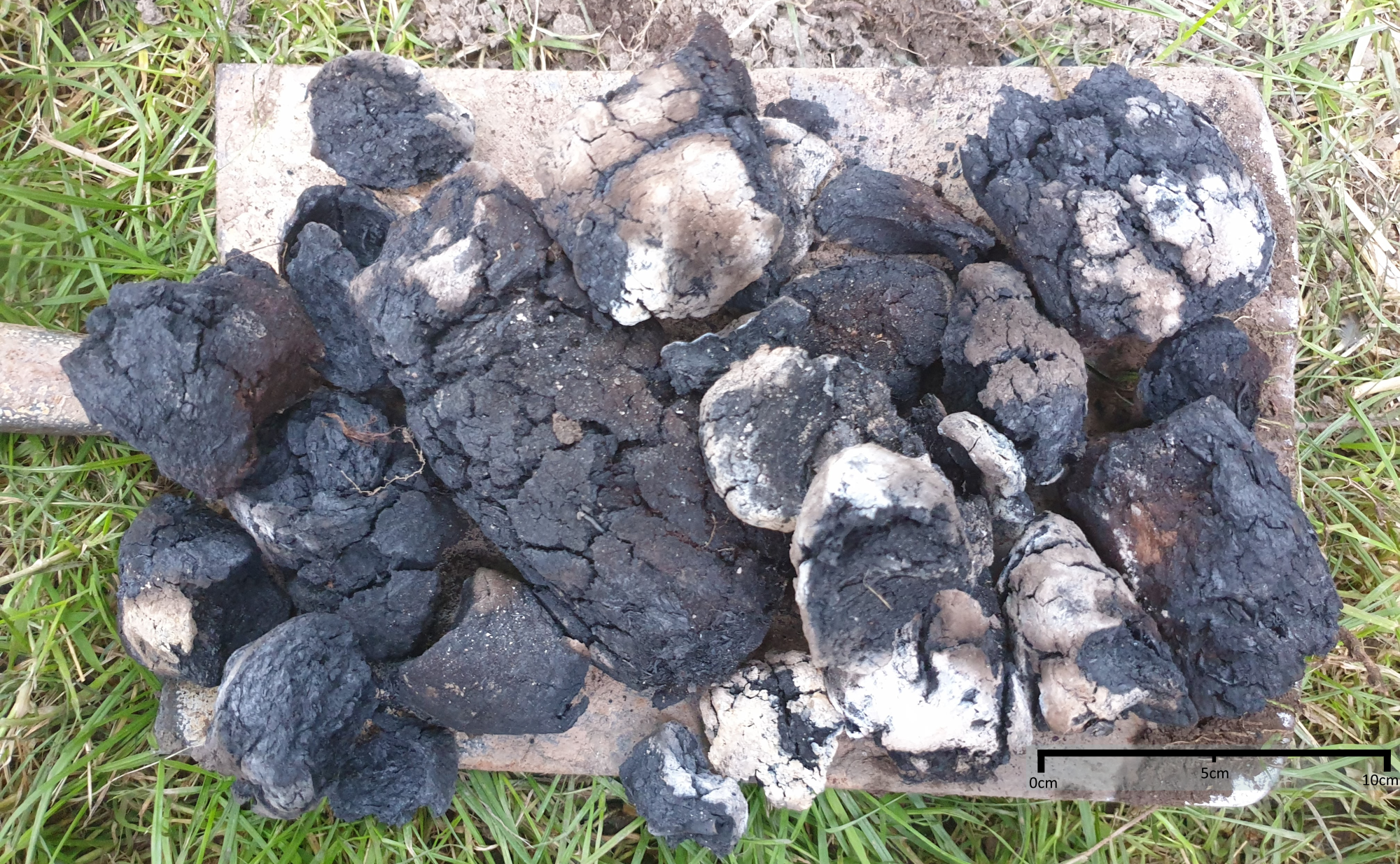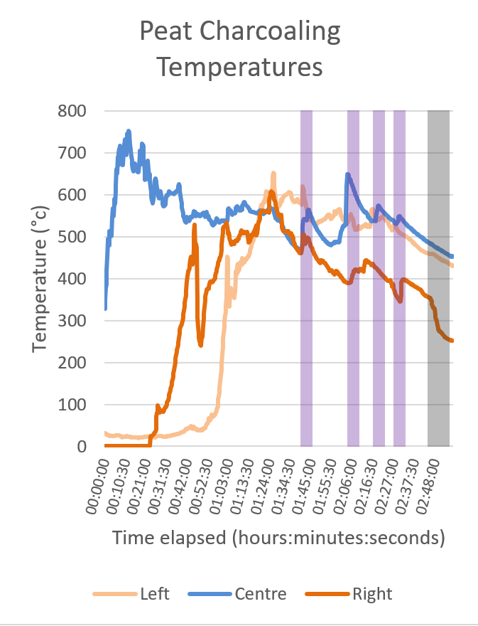 The aims of this research were to assess the yields and the influences on the outputs of peat charcoaling. To do this, a series of 10 experimental charcoal attempts were conducted following these ethnographic and historic accounts. Field observations including the quantity of peat put into each charcoaling attempt, the moisture of the peat, the amount of artificial fanning carried out, the types and quantities of material recovered from each charcoal attempting, and the temperature profile of the charcoaling pit were recorded.