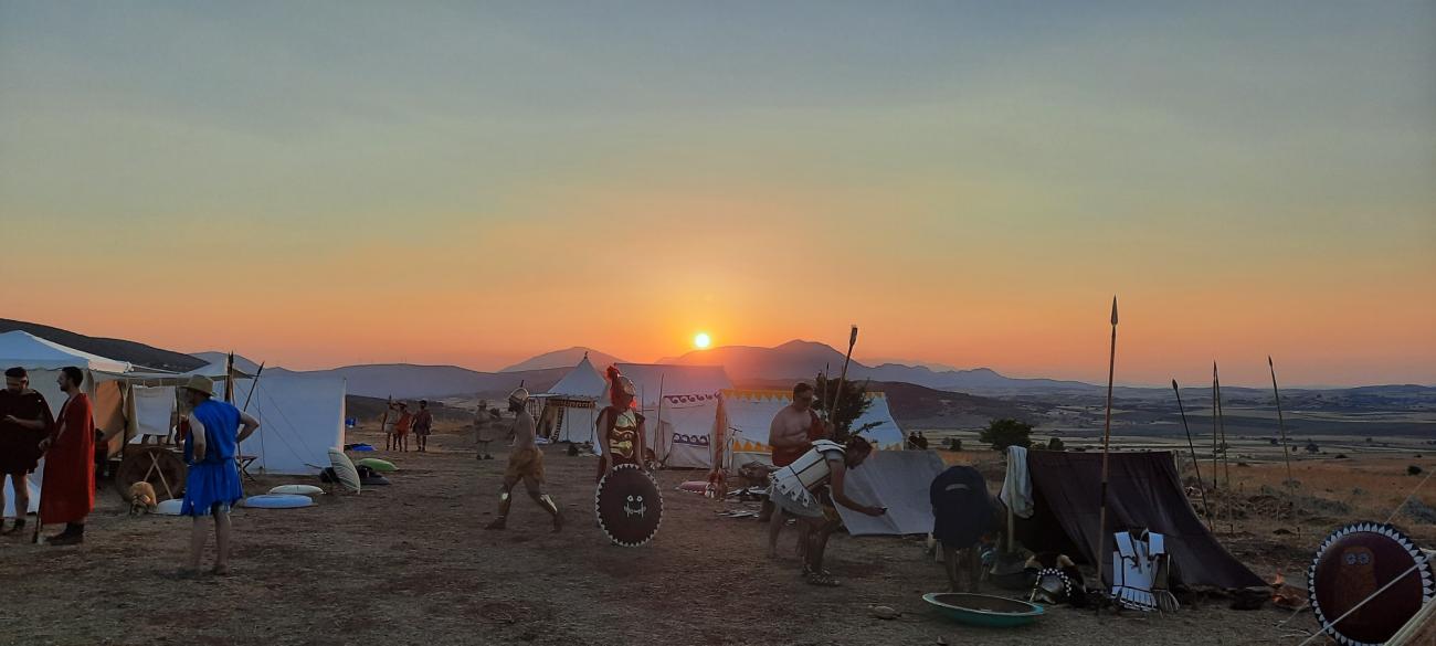 We must acknowledge that modern re-enactors are generally the wrong size and shape to fit surviving examples of armour. Most re-enactors are considerably older than the troops who fought at Plataea, and our modern western diet is very different to their barley based daily ration. This means little can be extrapolated in terms of calorie or water consumption during the 2022 event, but most of us lost weight while eating and drinking everything that came our way. The event was held during a period of intense heat, the countryside was tinder dry and fires were not allowed. Few participants felt like eating hot food, but fires would have served to keep the flying insects away. The surrounding wind turbines re-enforced the message that global warming was now a serious issue. Around half the attendees camped in mess groups on the battlefield, gently acclimatising to extreme weather conditions over the course of the event. A variety of styles of tent were on display, including two goat skin leather tarpaulins. When needed doors could be constructed using baskets, shields, and leather skins.