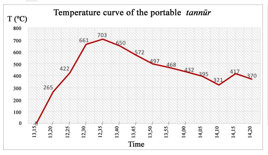 | Portable tannūr | 1st | Straw, grasses, pine wood | 14.719 | 3h45min | 429°C / 504°C | 70% | 21.6 | 14/11/2021 |