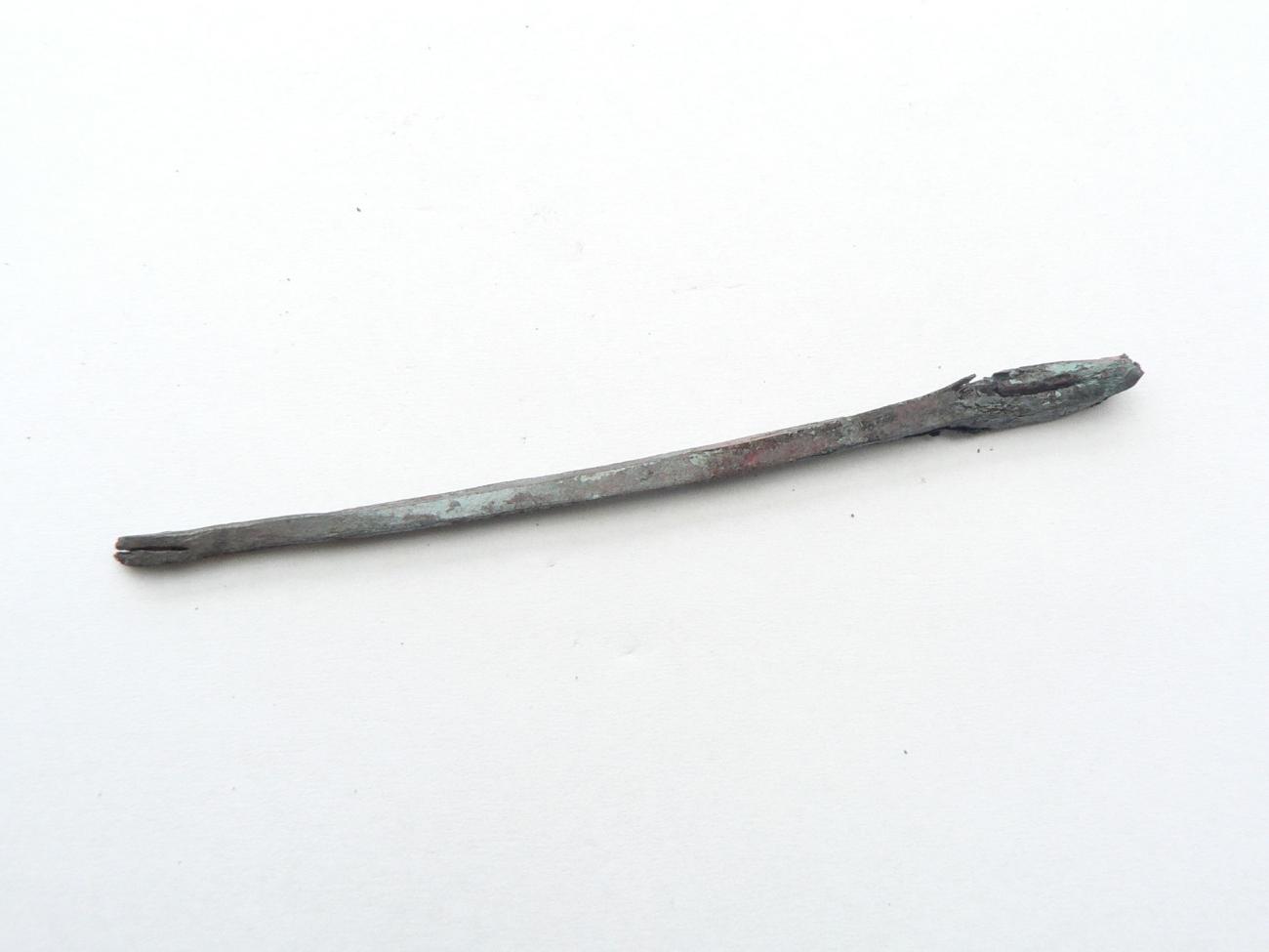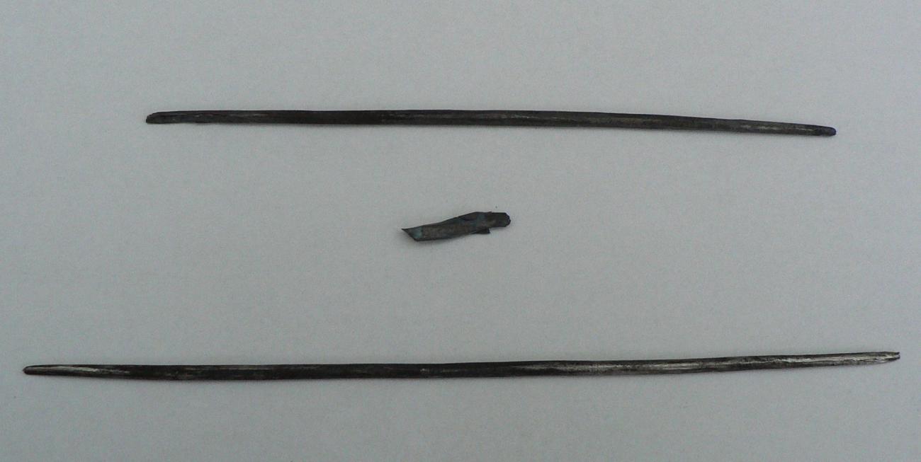 The drawing resulted in seven long iron wires that were 15-31 cm in length with diameters between 1.1 and 3 mm and several shorter wires. A modest amount of slag (under 50 g) lay in the forge and on the floor was anvil slag of quite a few hammer scale flakes and spheroids (10 g in total), as well as several pointed ends of forged rods and short pieces of drawn wire. This is such a characteristic waste, it should be possible to identify it in the archaeological material (See Figure 12).