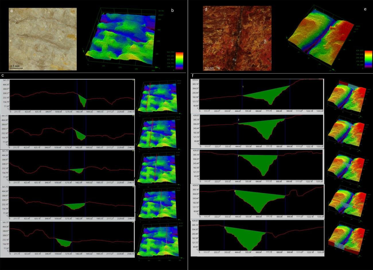The 3D pictures were analysed using the following criteria: cross-section, depth, cross-section internal area measurement, length for linear impressions, and surface and perimeter for punctiform impressions. The interior area of single cross-sections of markings was measured; the sections are obtained by slicing the 3D scan of the mark and moving a plane along its primary axis, capturing each section at regular intervals. Due to the great morphometric variability of the traces, the number of sections required is determined by the size and form of the markings.