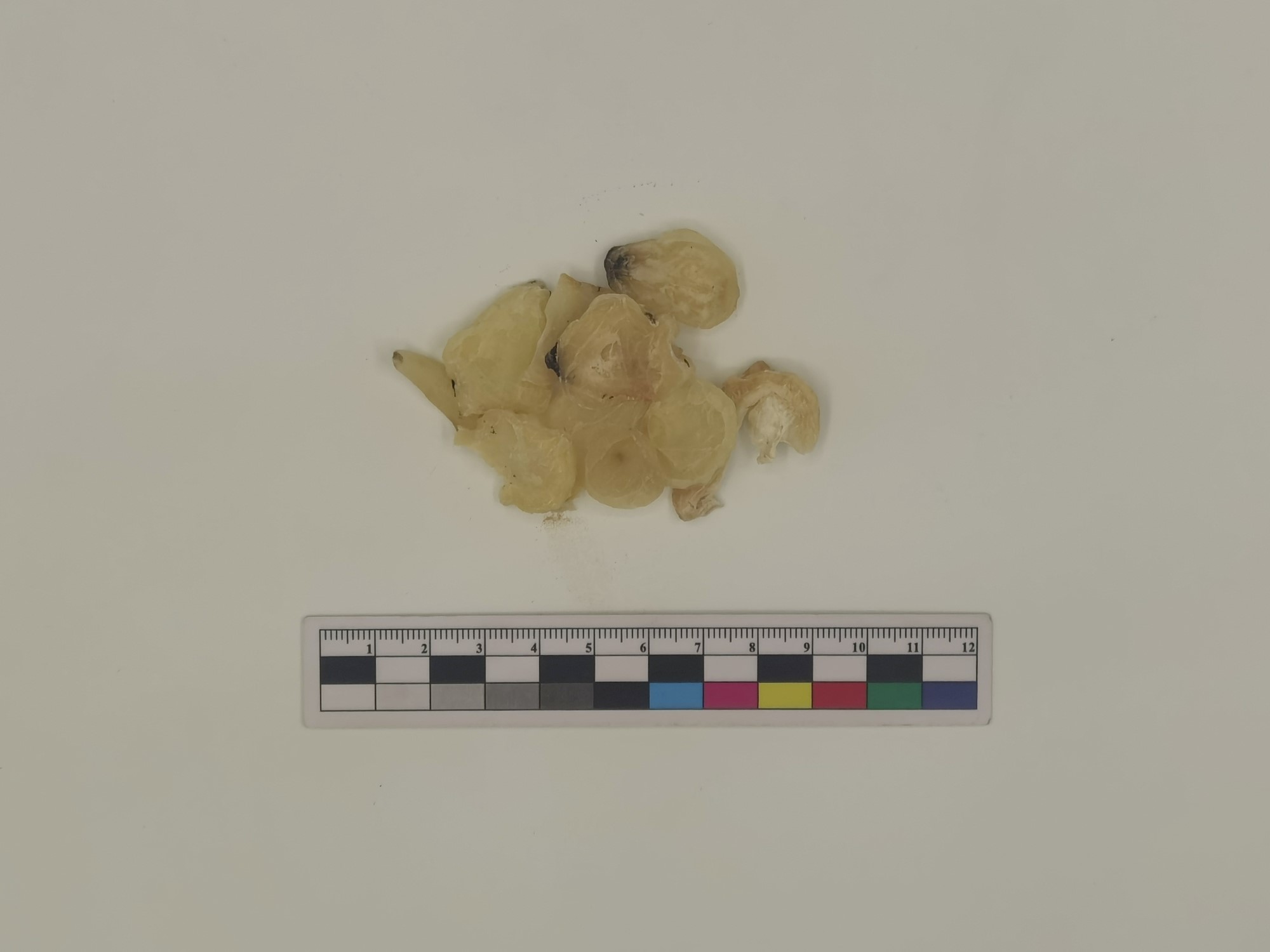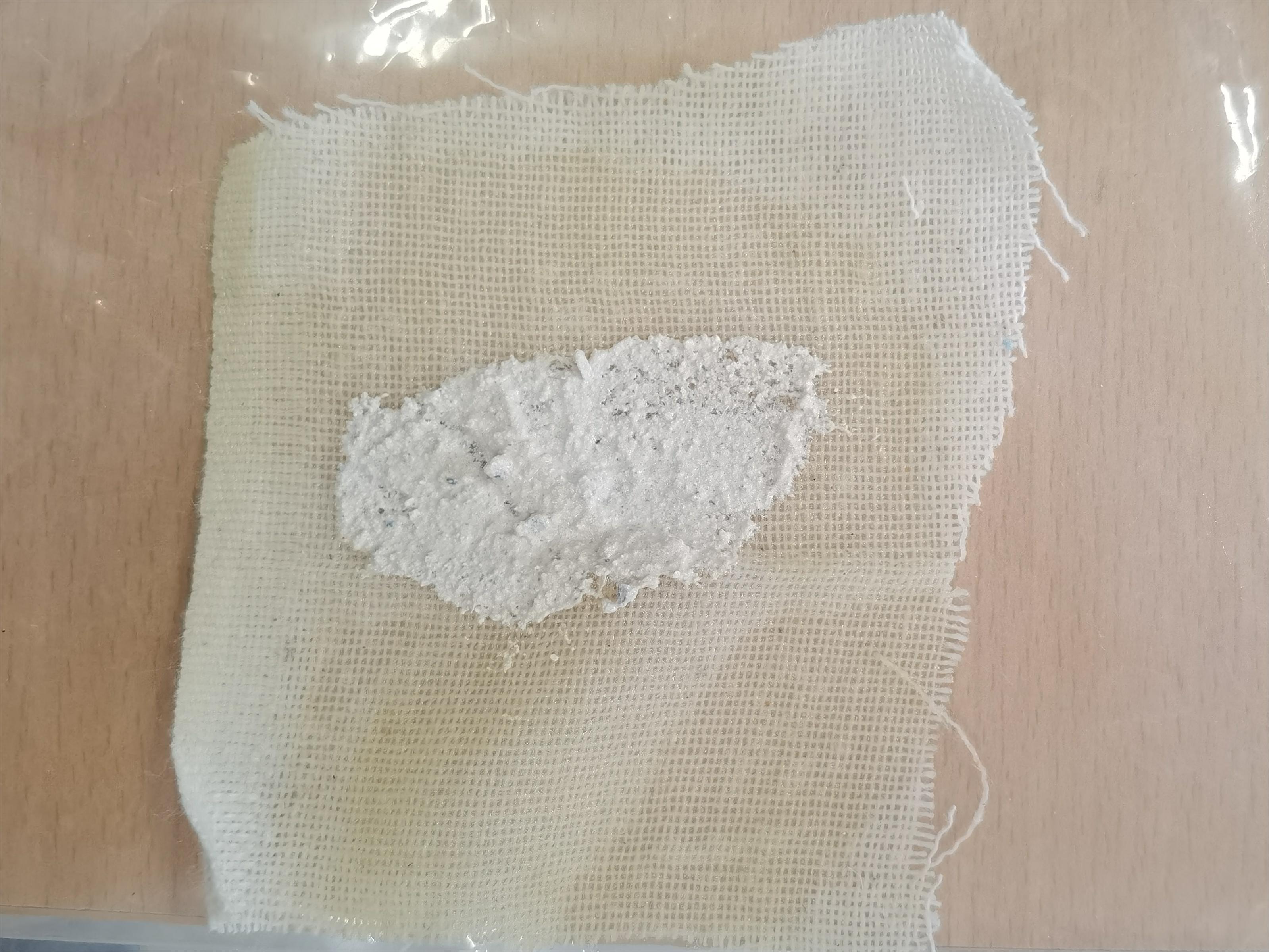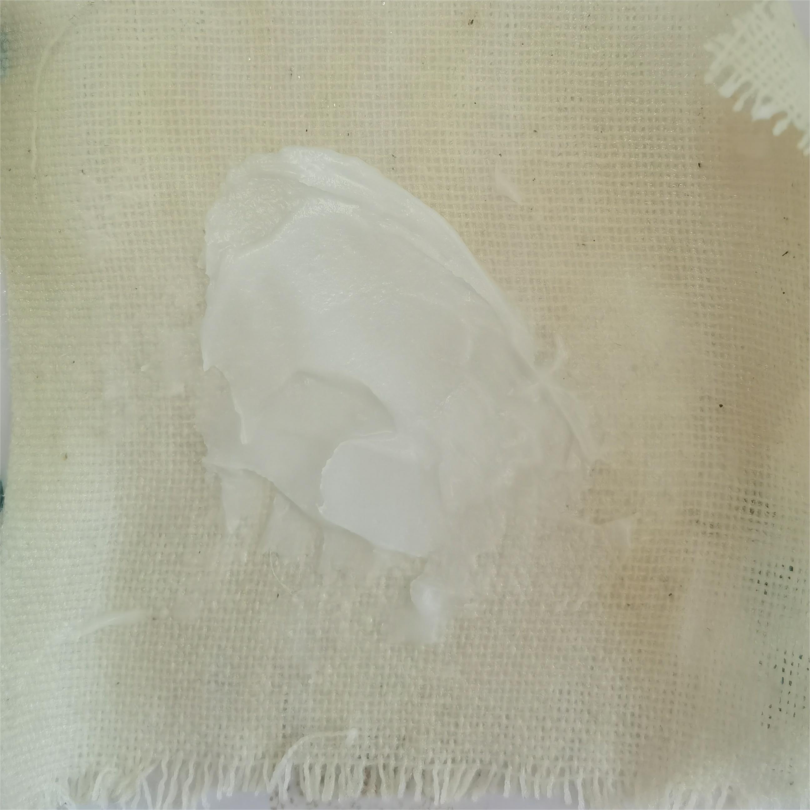 First of all, the egg was broken and the egg white separated from the yolk, and used to mix 3.45g of hufen (See Figure 34) and 3.45g of lime (See Figure 35) to form a creamy mineral hair colour (See Figure 36). Both hair samples were soaked and washed using ganshuijiang (See Figure 37) mixed with rice and water. The prepared mineral hair colour was applied to the washed samples until they were completely covered (See Figure 38). The youthful, coloured samples (See Figure 39) and the elderly coloured samples (See Figure 40) were immediately wrapped in oil-soaked silk. After resting for 8 hours, the coloured samples were soaked and washed using the zaodou liquid prepared during the preparation of the experiment (See Figure 41). After which the coloured samples were placed in a shady, light-protected environment to await further observation.