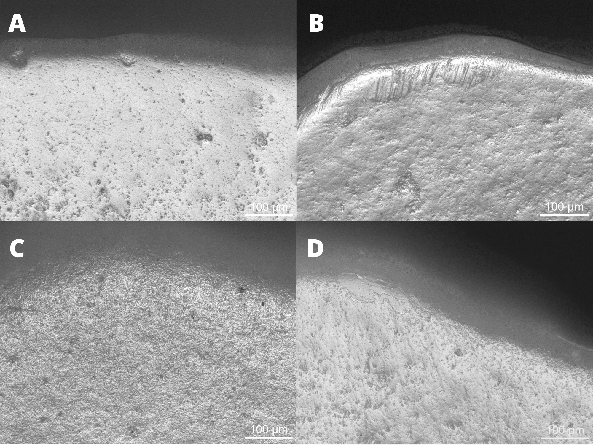 Two scrapers were used on a seal skin with sand as an additive, the other two experiments were used to scrape the skins with clay (See Table 3). All four scrapers displayed a wide zone with macroscopically visible gloss along the edge. This macroscopic gloss was previously also identified on an experiment by Van Gijn in which a fresh deerskin was scraped with ochre (Van Gijn, 1994, pp. 181-183).