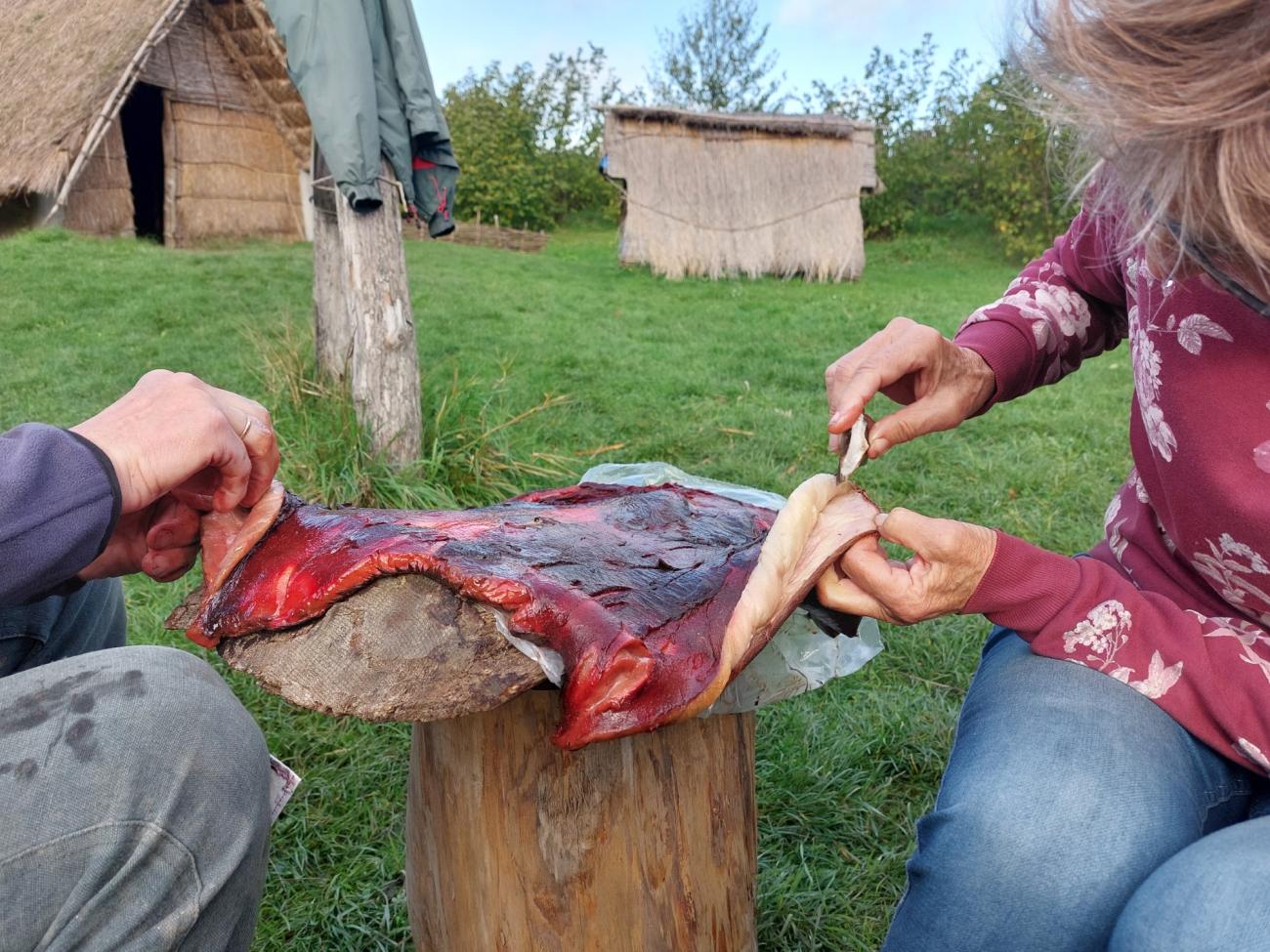 These traces are occasionally found but are still poorly understood. It has therefore been suggested that more experiments are needed to better understand these traces (Van Gijn and Niekus, 2001, p. 311). This paper presents a series of experiments where we scraped sealskins, using sand or clay to remove the fat. It will also present the analysis of the scrapers from Hekelingen III. It was suggested that some of these might have been used to scrape fatty hides with mineral additives. This study is part of the research project Putting Life into Late Neolithic Houses: Investigating domestic craft and subsistence activities through experiments and material analysis. The project aims to provide a detailed analysis of domestic life in the Late Neolithic Vlaardingen Culture (3400-2500 BC). In the project scientists collaborate closely with volunteers of the archaeological open-air museum of Masamuda in Vlaardingen (The Netherlands). The experiments presented here were carried out by the volunteers of Masamuda during a workshop.