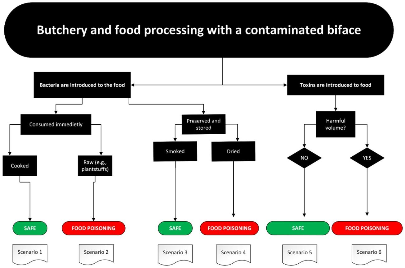Using contaminated butchery tools to process food likely results in cross-contamination: analogous to the situation controlled by modern regulations on cutting board use (Cliver, 2006). If food is fully cooked after cross-contamination (scenario 1), bacteria will be neutralised and not result in foodborne illness. However, if food is not fully cooked after (e.g., processing of readily edible plantstuffs), then bacteria introduced into the food will likely cause foodborne illness.