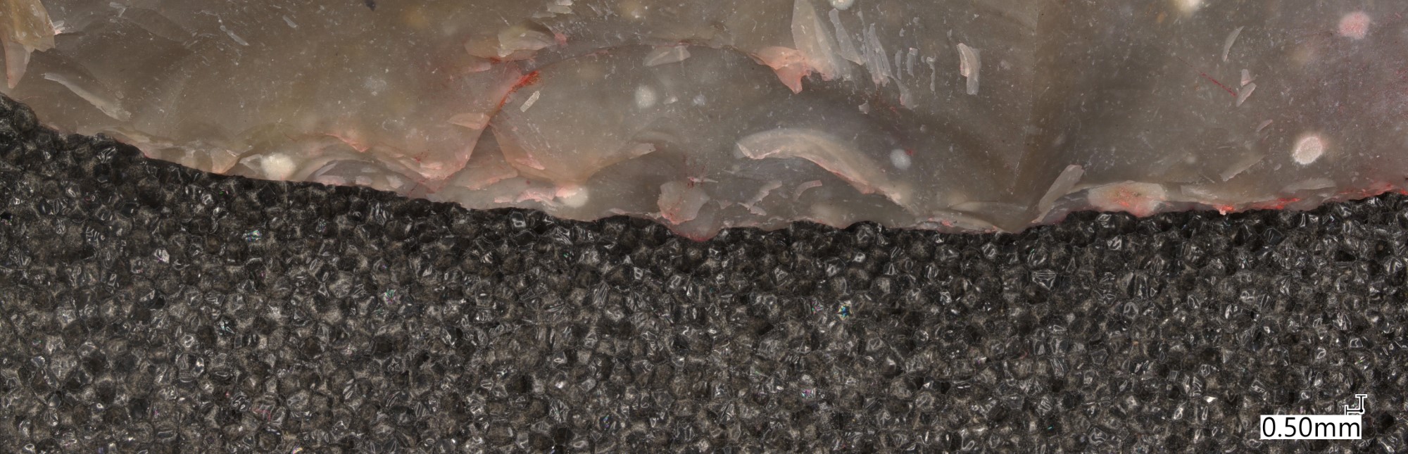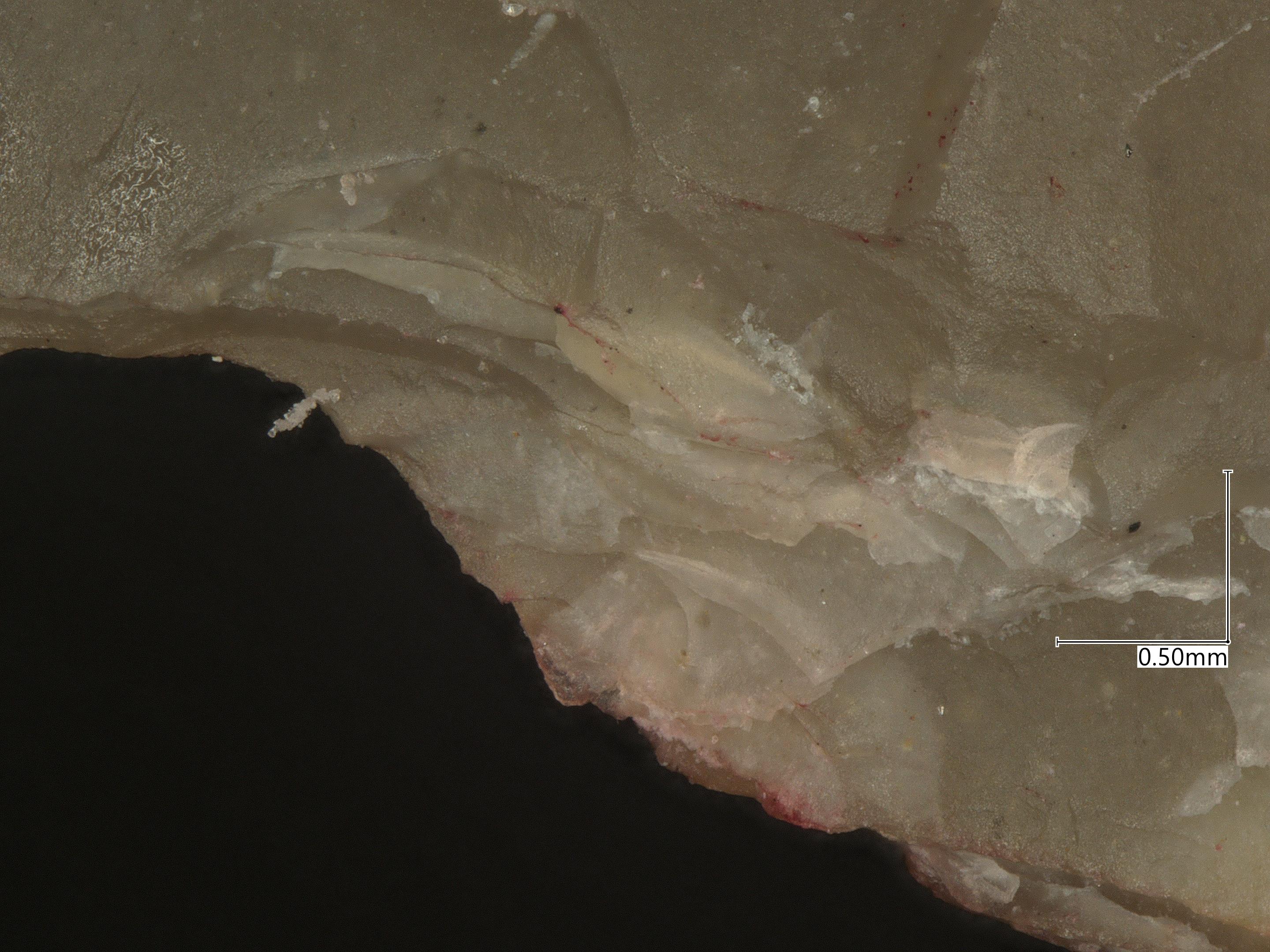 The frequency and location of individual micro-niche traps of biological matter - hereafter 'sites' - were recorded on an RTI (Reflectance Transformation Imaging) image for each biface. RTI images were selected as a rapid and accurate recording method: they allow key features, such as flake scars, to be easily located. For this preliminary study, the recording of an individual site does not vary according to the size or nature of the deposit of biological matter: it simply records the existence of a surviving continuous deposit of biological matter. Images of micro-niche sites were captured using a Keyence VHX-7000 digital microscope.