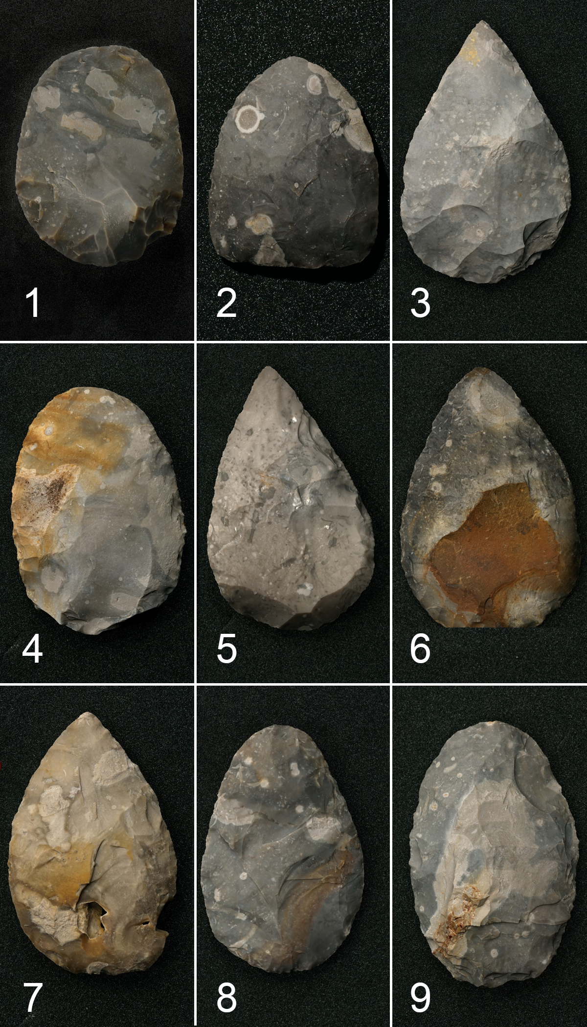 To test our Pathogenic Hypothesis, nine replica flint Acheulean bifaces were manufactured by one of the authors (CS). The manufacture included both hard and soft hammer percussion, to produce tools technologically and morphologically similar to those found in the Middle Pleistocene (See Figure 3).