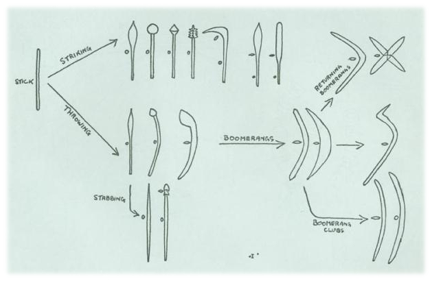 Confronted by the paucity of the archaeological record, a hypothesis on the evolution of throwing sticks cannot be based only on the rare preserved artefacts but also has to rely on more abundant ethnological and ethnohistorical data. Previous theories about the development of throwing stick technology focused exclusively on explaining the invention of boomerangs in Australia, so they focused on a particular type of specialized throwing stick. The famous antiquarian, Augustus Pitt Rivers, studied the evolution of these projectiles from prehistory to modern times and had a life-long interest in boomerang technology, studying ethnographic throwing sticks from Australia, India and Egypt. He experimented with many replicas, and defined four steps in the technological evolution of these objects thrown as projectiles to explain the appearance of the returning type (boomerang): a first phase of use of raw branches without modification, thrown in rotation; a second phase of discovering the stabilization by curvature, increasing range and accuracy; a third phase of cross-section improvement by splitting wood branches to create a plano-convex cross-section; a final fourth phase of improvement using throwing experience to control the returning flight (Pitt Rivers, 1883). Another study on the technological development of throwing sticks is the diagram of Bryan Cranstone, who was the curator of the Pitt Rivers Museum from 1976-1985. His diagram is more a functional typology than a scheme of technological evolution, and he focused on the functional specialisation of striking and throwing sticks (including boomerangs) (See Figure 1).