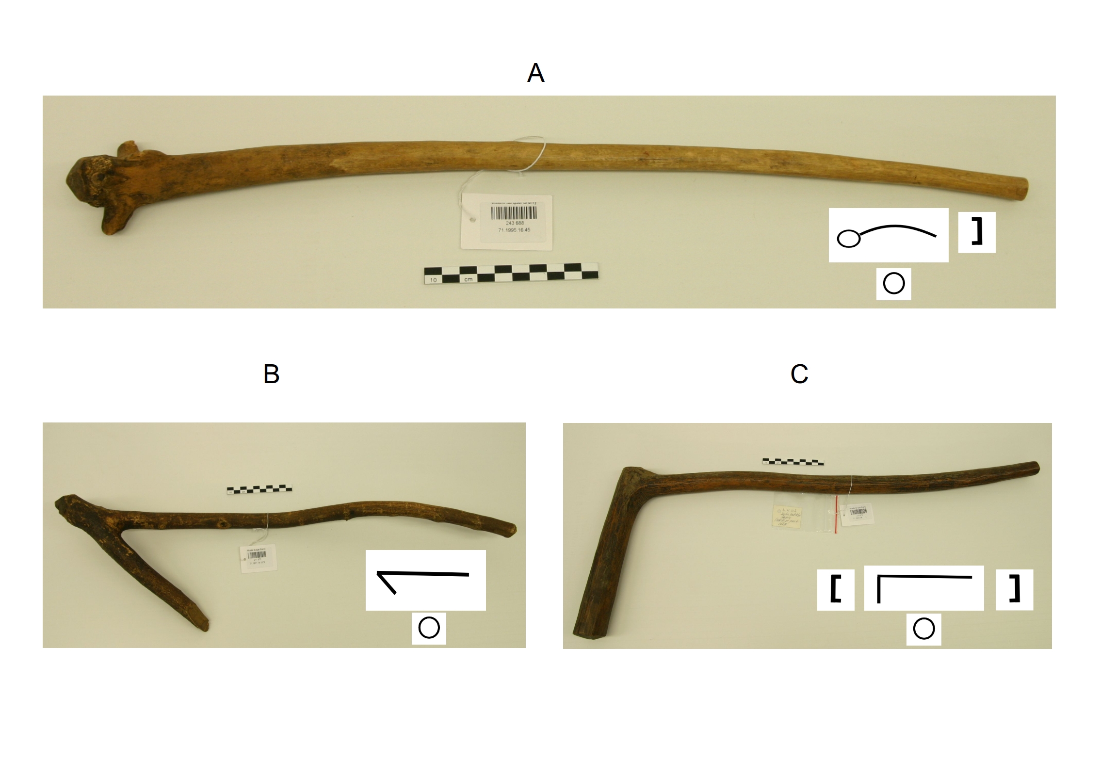 Another large category of asymmetric throwing sticks is those without any bulge, and with more constant thickness and wideness from end to end. These implements could have been manufactured by collecting branches with a natural turn and elbow. Their initial function probably included use as a club or for plucking, but they were probably multifunctional tools, even more polyvalent than the previous group described.