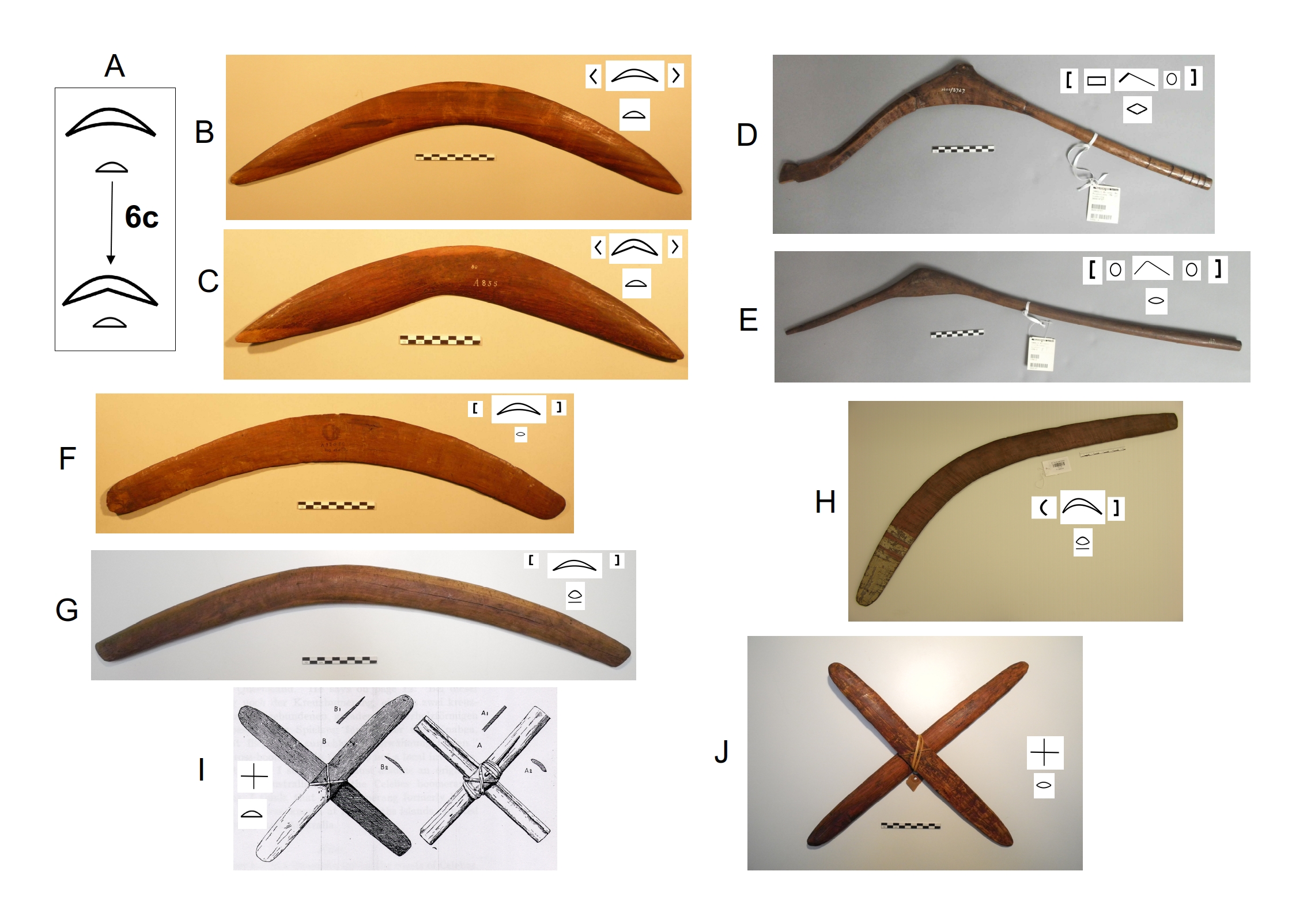 | VI Diversification, new shapes and airfoil sections, use of metal | - New aerofoil section (rectangular, rectangular convex, semi-convex, diamond) - Truncated and beveled extremities - Use of metal | - Throwing sticks mixing archaic, new aerofoil sections and recent type of extremities (beveled, truncated) (2b, 6a, 11c, 12c) - Appearance of crozier shaped throwing sticks linked to new functions (5a) - Development of "L" shaped throwing stick with widened short blade (7a) - Cross boomerangs (13c) | 10 ka - present |
