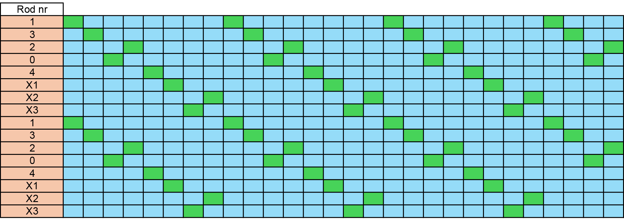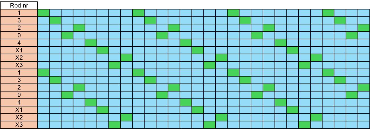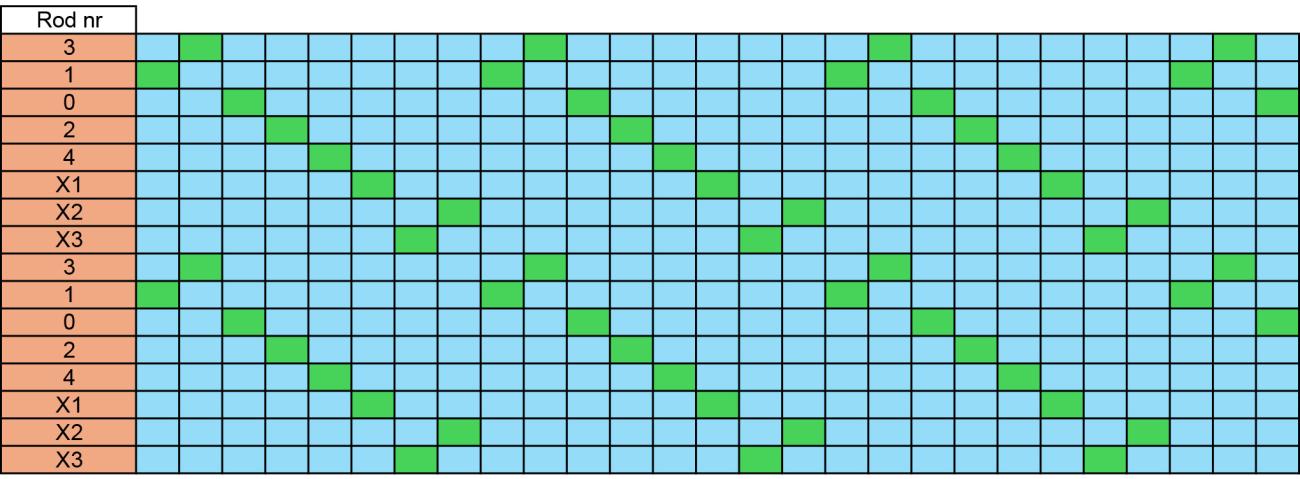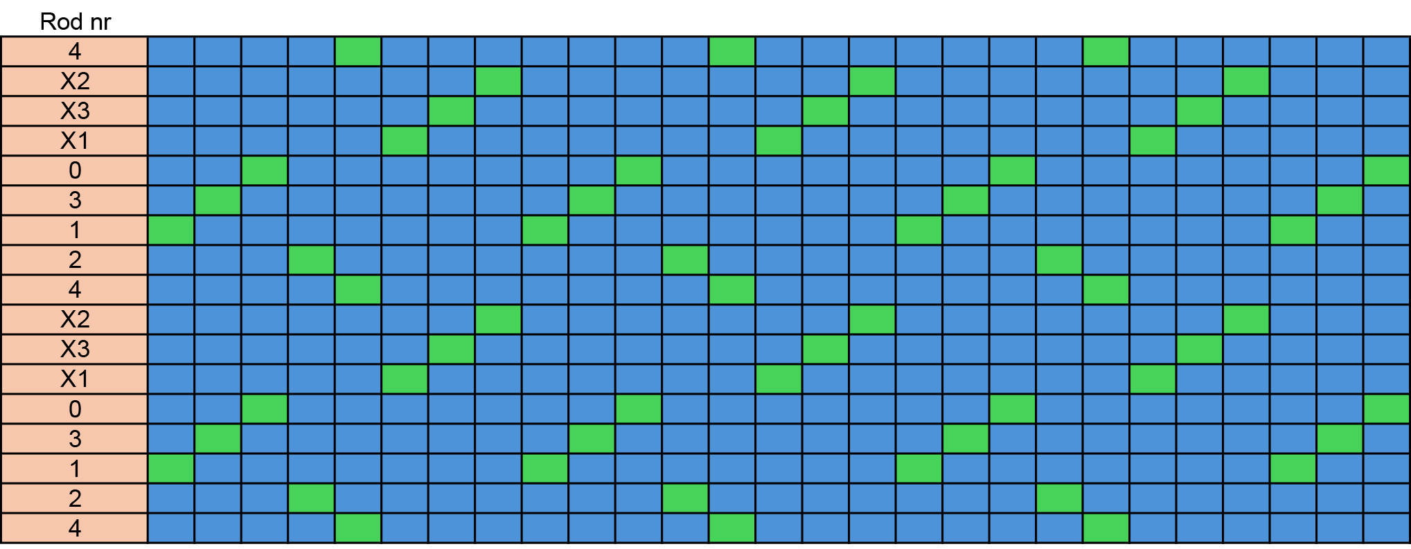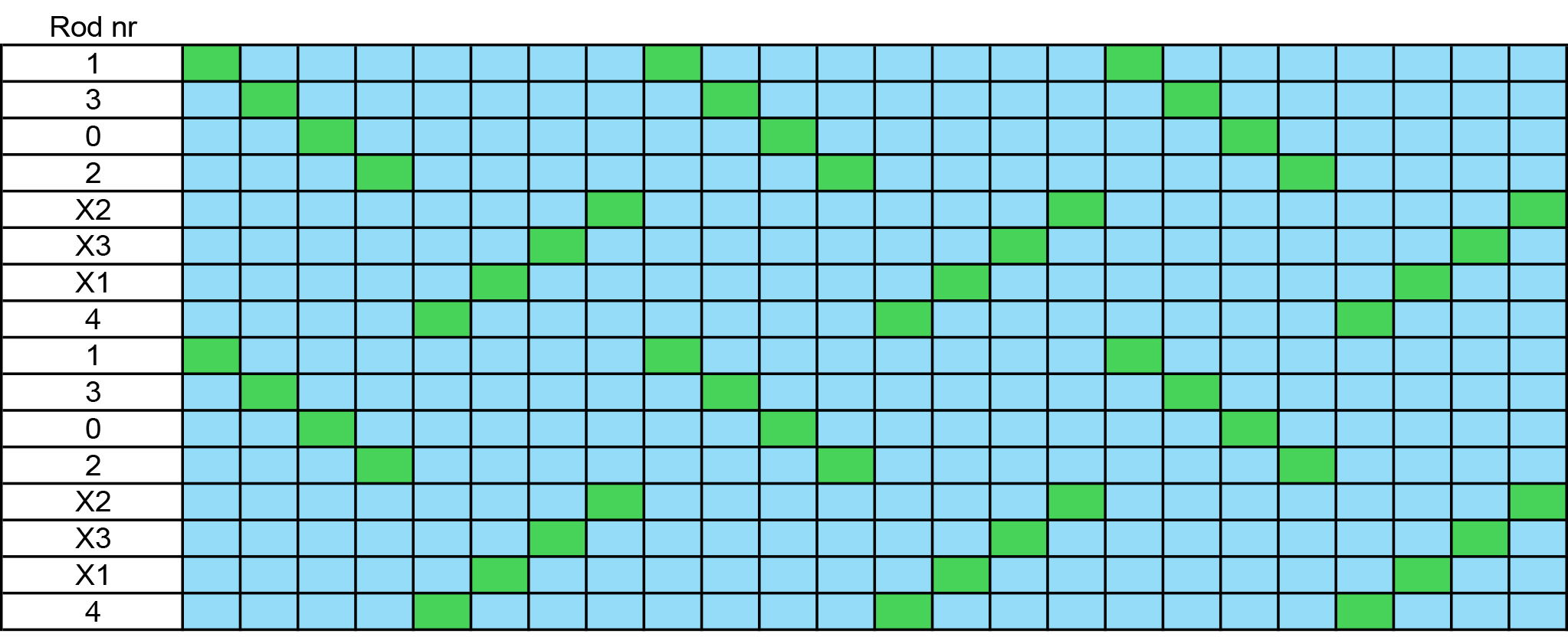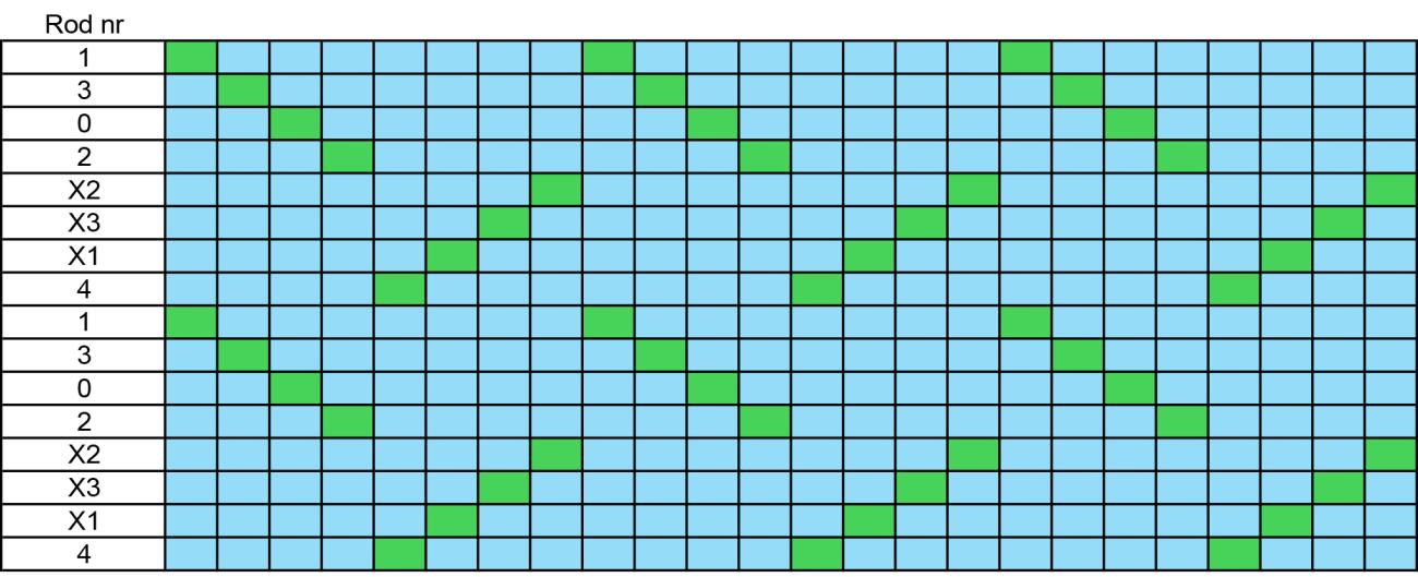 In preparation I drew different types of patterns using the guidelines for how to make a 5-end regular satin pattern (Zetterström, 1983, p. 34) (See Figures B, D, E, F, G, H, I, J and K). Back in 2020, when I put up the 3/1 chevron twill, I got extra warping threads in an extra shed. Since the 3/1 chevron twill and the 5-end satin patterns are quite similar, I believed I would get extra warping threads this time too. Therefore, I decided to go for an 8-end regular satin with a counter of three, even if I could only use five rods, since there was no space for more than five rods on my warp-weighted loom (See Figure 7).
