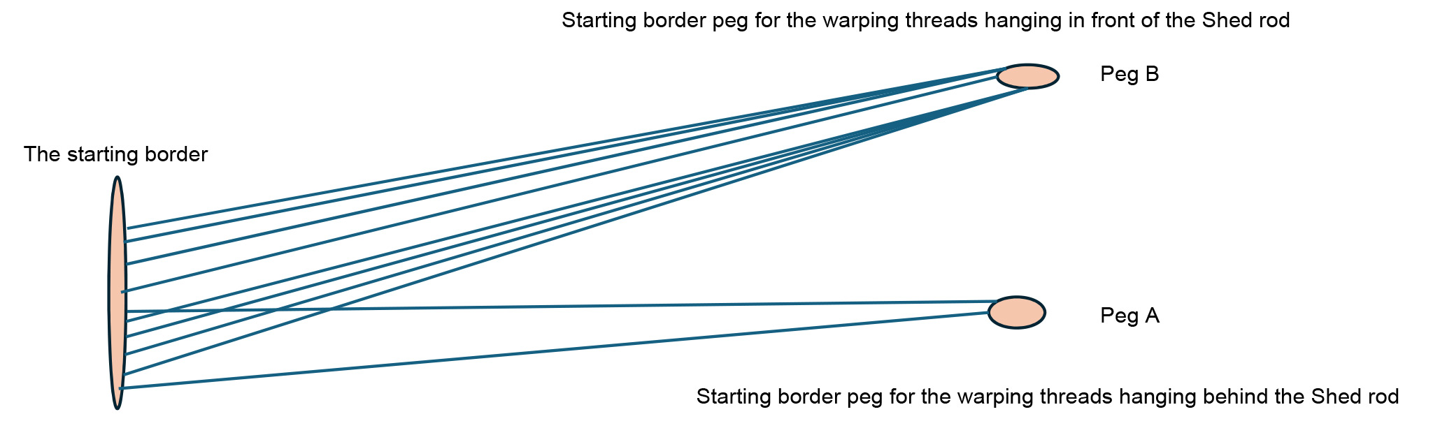 - I made the warping threads by taking the first loop formed by the weft of the starting border, carried it over to the left peg, and dropped the loop down onto the peg (See Figure A).