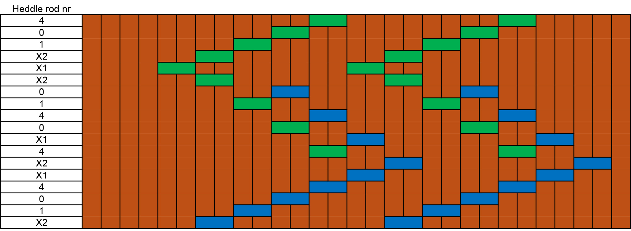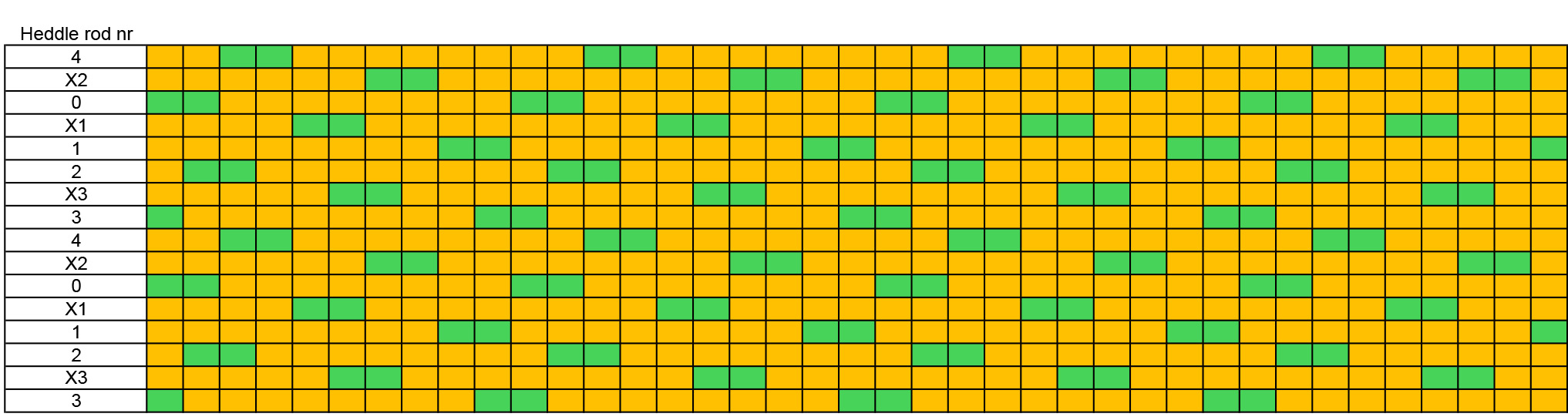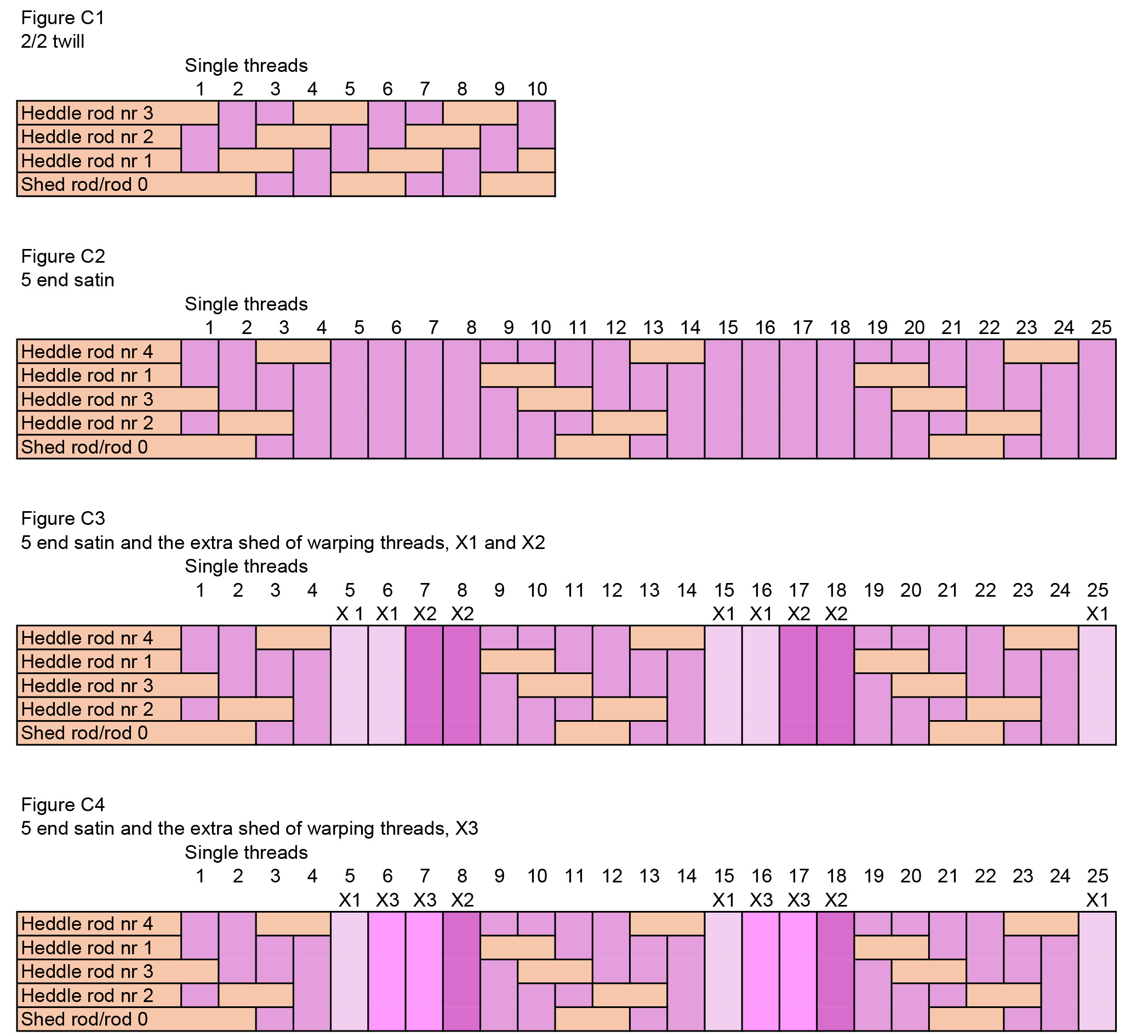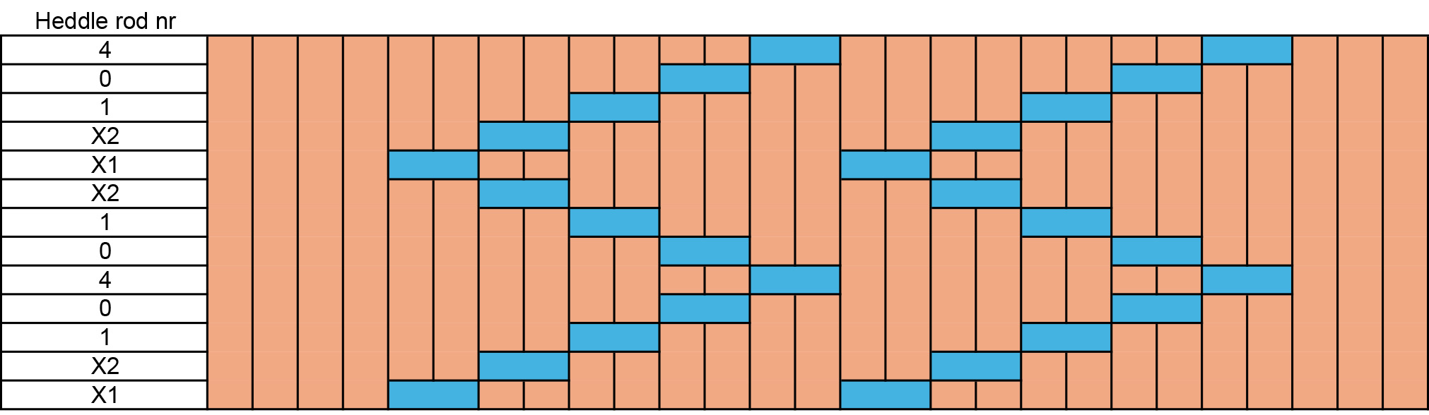 Another important point is that if I had enough space on my warp-weighted loom to put up extra heddle rods, both my test weaves would have been 7-point satin (See Figure 7). The reason for that is that there are seven pairs of double warping threads in the setup, and therefore seven interlacing numbers in my pattern, which is 0, 2, 3, 1, 4, X1 and X2. X3 is not a pair of double warping threads, since it is half of X1 (the second single thread in the pair of double warping threads for X1) and half of X2 (the first single thread in the pair of double warping threads for X2) (See Figure C). If I understand the secrets of the warp-weighted loom correctly, I could not weave an 8-point satin with seven rods. If I had set up seven rods on my warp-weighted loom, it would not have been possible to handpick X3, since X1 and X2 would have been connected to two separate heddle rods. X3 is there for a bonus interlacing, as I see it. The interlacing numbers for a 7-point satin are 2, 3, and 4 (Zetterström, 1983, p.34). However, it is possible to weave 8-end satin with five rods on a warp-weighted loom (See Figure 7).