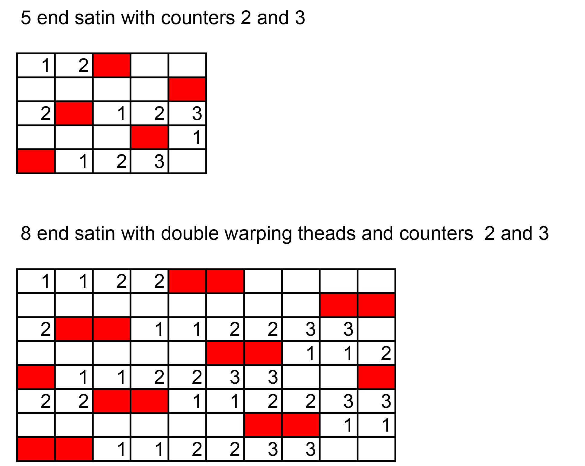 It is also possible to weave an 8-end satin. The only possible counters for a 5-end satin are two and three. For the 8-end satin the possible counters are three and five (Svarstad, 1998, p. 25). Will it be possible to do the same on a warp-weighted loom?