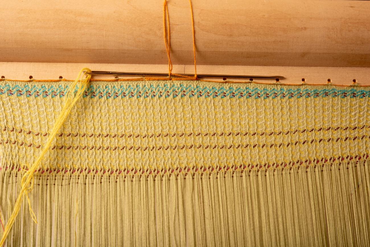 - I chained down the warp and stitched the starting border onto the beam on my warp-weighted loom (Olsen, 2014, pp. 64-67).