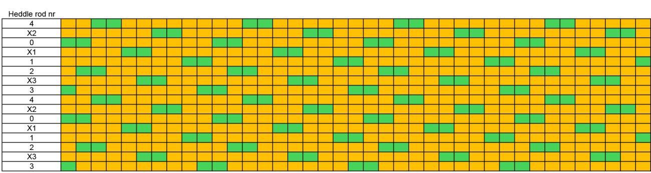 The extra warping threads came from the starting border as single threads numbers 5, 6, 7, 8, 15, 16, 17, 18 25, 26, 27,28, 35, 36, 37, 38. Single thread numbers 5, 6, 15, 16, 25, 26, 35 and 36 were named as X1. Single thread numbers 7,8, 17, 18, 27, 28, 37, 38 were named as X2. To get an 8-end satin I used single thread numbers6, 7, 16, 17, 26, 27, 36 and 37 and named this as X3. (See Figure C).
