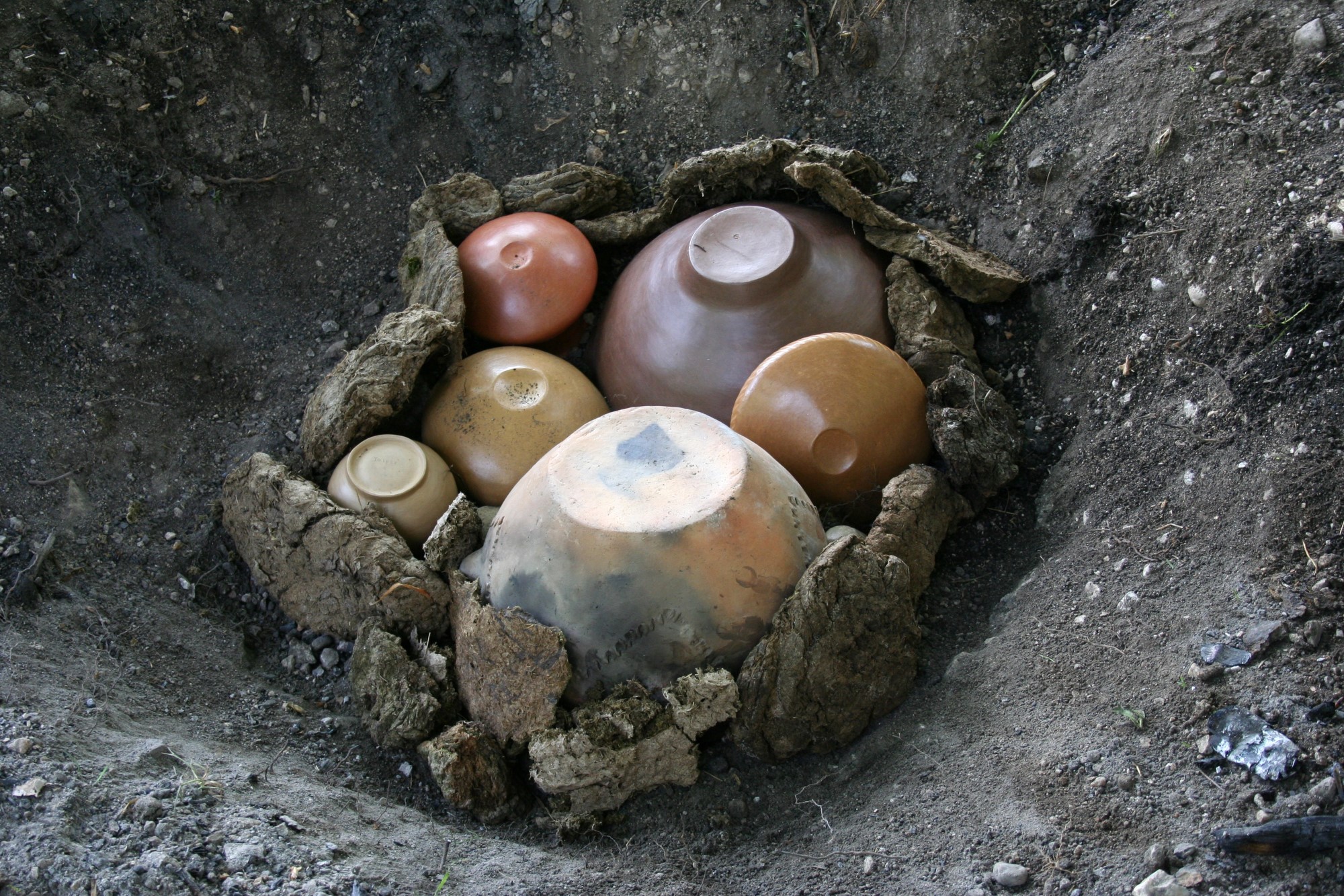 A depression (shallow pit) 1.10 x 1.40 m in size and 0.30 m deep was dug in the ground and used for all three open-air firings. Although not precisely the same, the total volume of the pile of the pottery in each firing was similar, with a maximum size of 0.40 x 0.35 m, and a maximum height of 0.17 m.