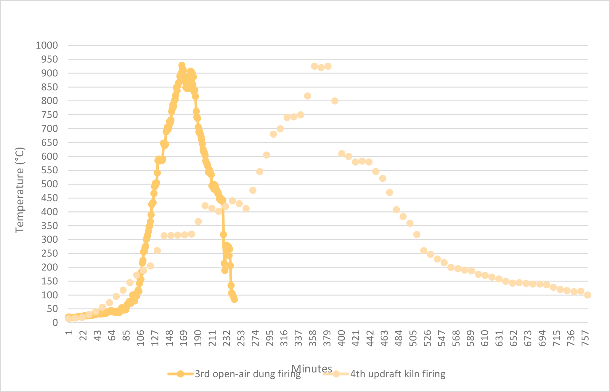 Given the above, full documentation of every single traditional firing was carried out (See Table 2) with the main focus on the following thermal characteristics: maximum temperature, heating rate (average temperature per minute to reach the maximum temperature), soaking time (namely, time the pottery was subjected to above specific temperature thresholds, for example, above 700° C, 800° C or 900° C, and/or at its maximum).