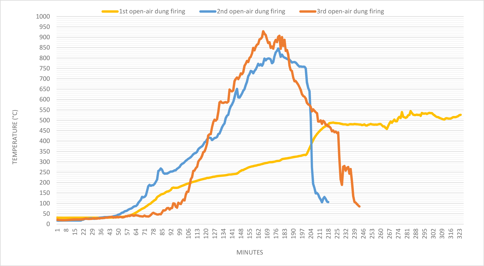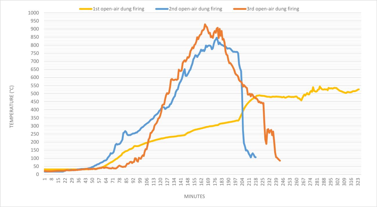 In the second and third open-air firings, as soon as the temperature reached its maximum, it immediately dropped sharply (See Table 2, Graph 4). This was not the case for the kiln firing, which maintained its maximum temperature for a longer period (See Table 2). The first firing constitutes a special example since the fire suddenly went out when the maximum temperature was still quite low.