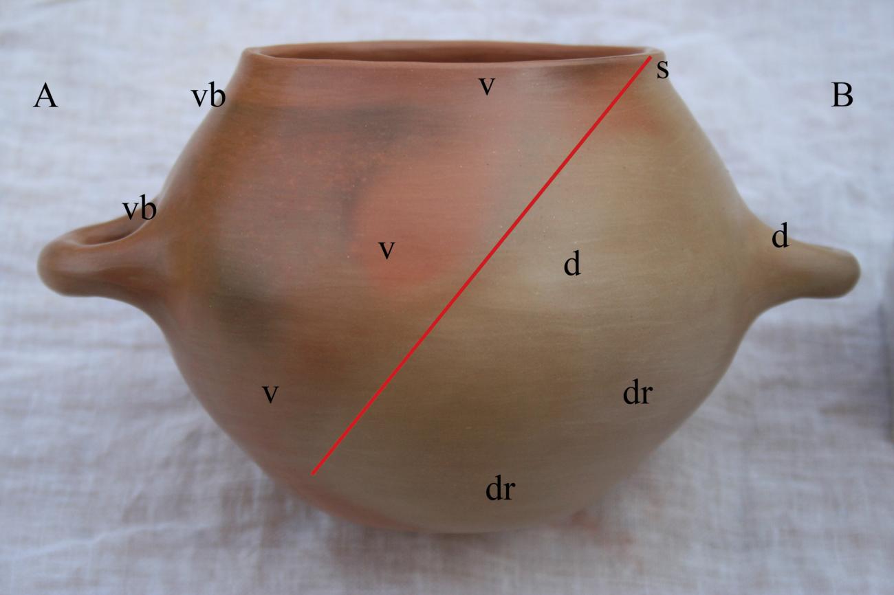 Over the past decade, the author has produced and fired dozens of handmade burnished vessels inspired by known examples from Greek prehistory, specifically in terms of shape repertoire, building methods, surface treatment, and firing technology (see: https://www.facebook.com/JasperHandmadeCeramics). Εarlier observations made in collaboration with M. Zavadil on the reduction of the sheen of several heavily burnished pots in these firings prompted the design and implementation of the current experiment. The decline in the quality of burnishing was initially assumed by the author and M. Zavadil to be the result of the prevailing thermal conditions in specific sections of the wood-firing updraft kiln that was used (Kordatzaki and Zavadil, 2020). The lateral internal parts of that kiln, between the side walls and the perforated floor, were open to the firebox (See Figure 2). Consequently, the margins of the upper surface of the floor were immediately subjected to the intense heat, hot gases, and combustion products (for example, suspended ash) that were released from the lower to the upper chamber. Due to this, specific sides of the burnished pots (for example, side B of the pot in Figure 3a) that were set next to the lateral gap in the kiln (See Figure 3b) were heavily disturbed and, in places, became noticeably rough. On the contrary, those sides of the pots that were facing towards the centre of the upper chamber (for example, side A of the pot in Figure 3a), appeared very bright and highly lustrous.