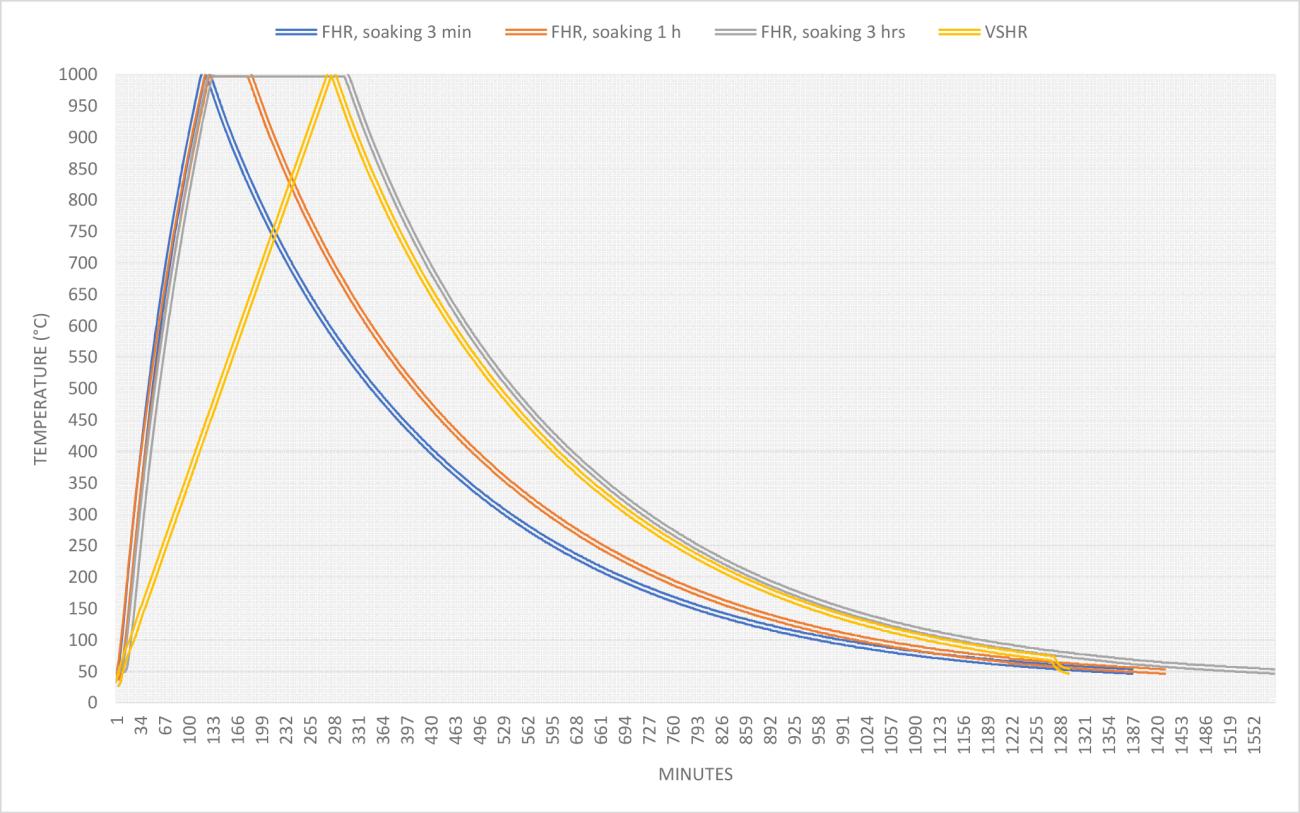 In the FHR controlled firings, the average rate to reach the maximum temperature of each firing ranged between 8.41-9.85° C/min (for the detailed characteristics of the controlled firings, see Table 4). However, regardless of the maximum temperature, the actual heating rate to reach the previous temperature thresholds was consistently the same (See Graph 2). For all VSHR firings in the laboratory, the maximum temperature was reached in five hours, and the average heating rate was below 3.33° C/min.