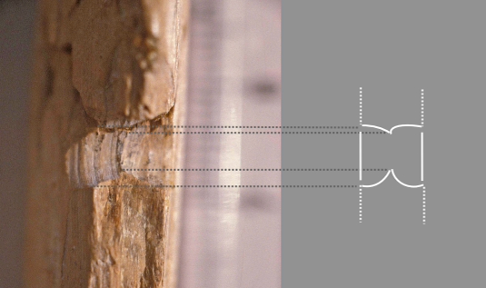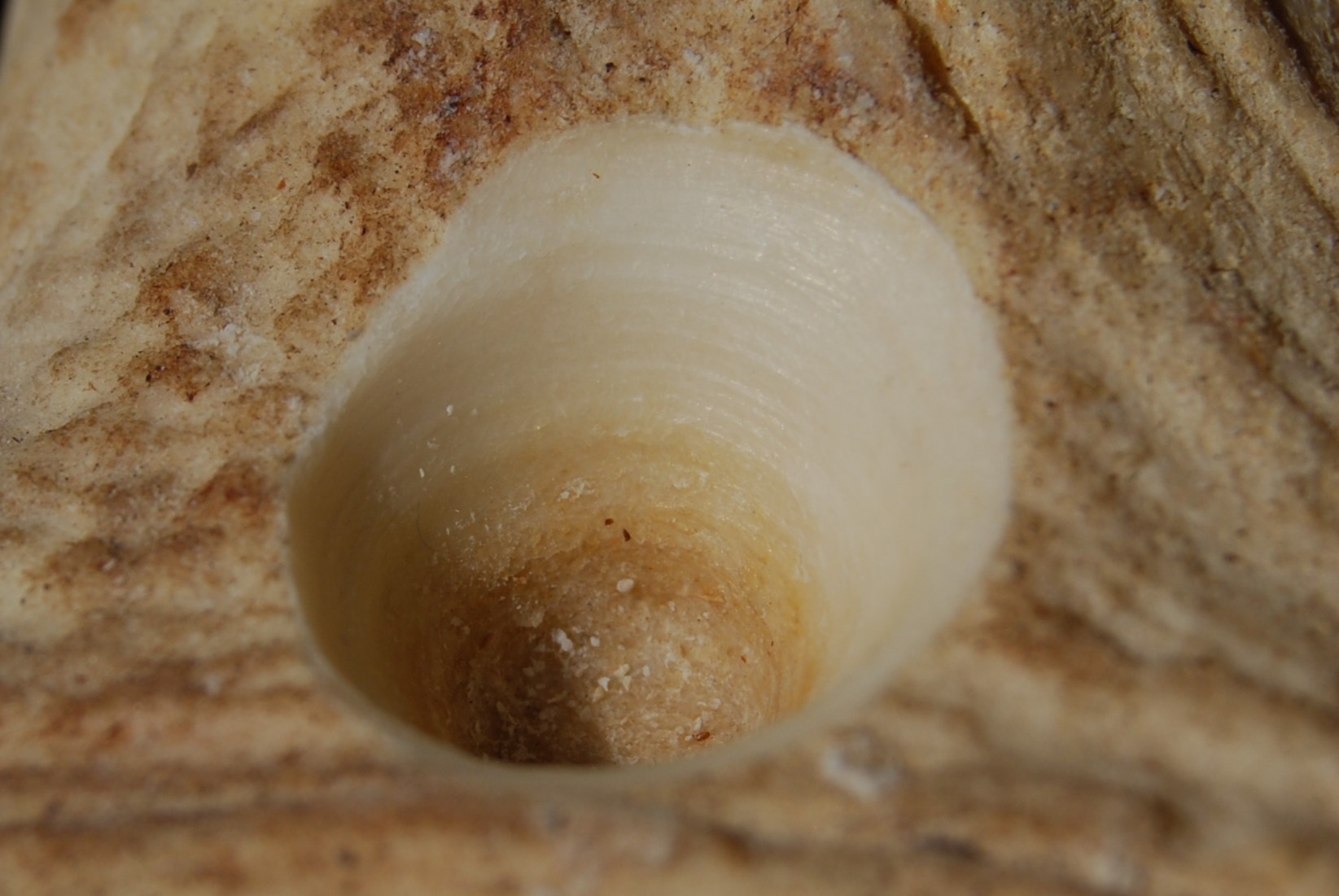 By contrast, when the tool has W:T > 2, it has only the two lateral edges in continuous contact with the perforation walls (See Figures 13a-c). This was found to make the tool inherently unstable when drilling or boring: the axis of perforation was not kept constant at 90° but tilted regularly, and the tool frequently became dislodged, especially when bow drilling. These problems began to manifest once the perforation reached a few millimetres in depth, and they increased as the depth increased. This resulted in a very consistent pattern in the course of the experiment: boring or drilling started smoothly, but once a certain depth was reached the tilting of the axis of perforation and consequent uneven abrasion around the perforation walls resulted in the formation of angles in the circumference of the hole, which became more pronounced as the experiment continued. These corners made it increasingly difficult to rotate the tool within the hole, and ultimately made further bow drilling impossible (though it was always possible, if laborious, to complete a perforation by hand boring). This consistent pattern of difficulties produced perforations conforming to morphological type B (See Figure 8): the formation of multiple corners resulted in a hole with a rounded polygon shape in plan, while the upside-down mushroom profile is thought to result from the erratic tilting of the axis of perforation, which caused the tip of the tool increasingly to gouge material laterally from the spongy tissue of the perforation walls as the hole deepened and the axis of perforation became increasingly unstable