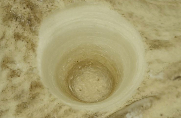 Eight perforations were produced in the course of the experiments (See Table 1). They ranged in size from 16 to 23 mm maximum width and from 9 to 17 mm maximum depth, and took between 40 and 140 minutes of continuous work to complete. Each perforation conformed to one of two distinct morphological types. Type A (See Figure 7) is circular in plan and funnel-shaped in profile. Clearly, if this kind of perforation were replicated on opposing faces of the antler so that the two holes met in the middle, the result would be the biconical profile observed on many archaeological heavy tools (for example, Riedel, Pohlmeyer and Von Rautenfeld, 2004, p.203). Type B (See Figure 8) was more irregular, characterised by a rounded polygon shape in plan and a profile resembling an upside-down mushroom: the walls slope gently inwards in the upper portion before bulging abruptly outwards after penetrating a certain depth of spongy tissue, creating a slight overhang, with the walls of the perforation in this broader basal portion being rougher and messier. These two types were correlated with differences in the form of the flint tools that created them, as will be discussed in full below (See section entitled 'Lithic tool thickness determined perforation morphology'). Crucially, differences in perforation morphology were not found to be sensitive to differences in the way the flint tool was set in motion: when the same tool was used to produce two holes, one by hand boring, the other by bow drilling, those two holes were morphologically indistinguishable.