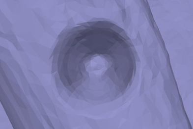 The models are also very useful for interrogating profiles: on every model the characteristic funnel or inverted mushroom profile was easily recognisable. Particularly valuable was the ability to view the perforation apparently inside-out, from within the antler itself, as though it were a solid object rather than a negative feature (See Figures 16c and d). This was found to facilitate visualisation of the perforation's 3D shape in a way that even an examination of the physical object itself could not match. It was also possible to create a half-section of the perforation by slicing the model vertically in two (See Figures 16e and f), another useful way of inspecting profiles virtually that would be impractical to replicate on the physical object. For viewing profiles 3D models are vastly superior to traditional alternatives: the practical challenges posed by such small holes make it impossible to photograph, and difficult even to accurately draw, the profile in full. Thus, the models proved very useful for the analysis and presentation of morphologies, despite their relatively low-resolution reconstruction of surface shape.