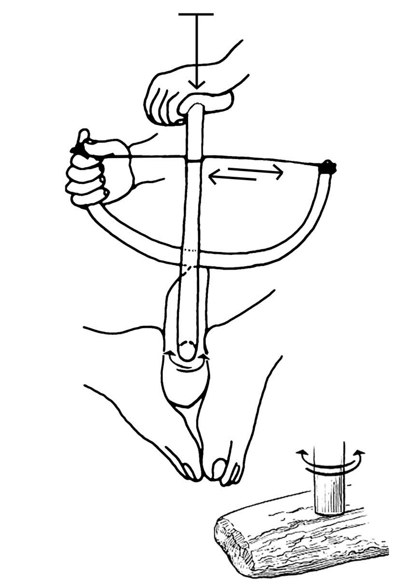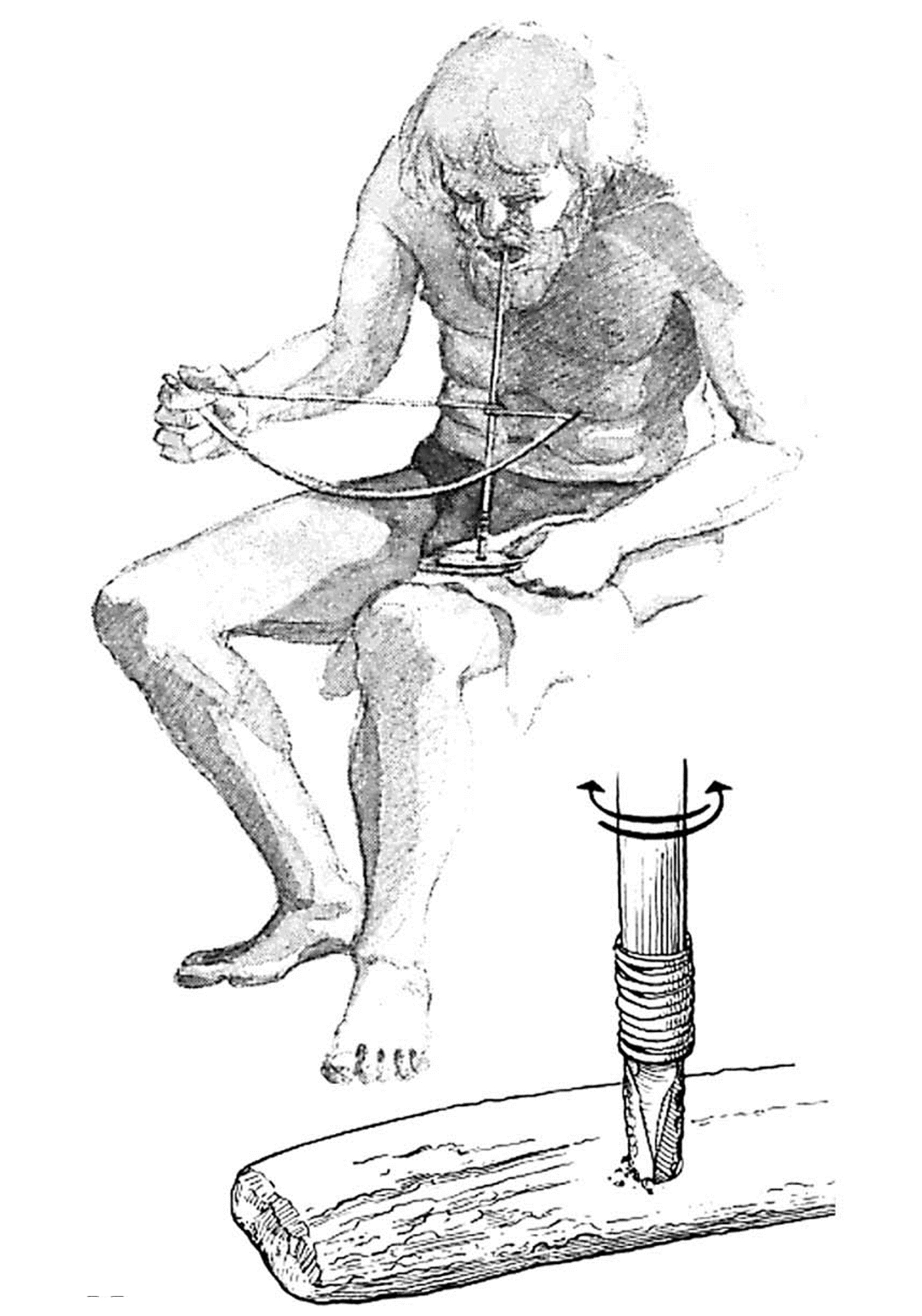 This conclusion provided the impetus for a series of experiments in which flint tools were used to perforate red deer antler. Rather than replicating specific lithic forms attested in the archaeological record, the decision was made to use the simplest possible form capable of doing the job; a simple flake, minimally retouched at the distal end so that it tapered to a central point. The aim of the experiments was to investigate the traceological consequences of manipulating specific technological variables. The first variable was the means by which the flint tool was set in motion, which was either by hand or using a bow drill. In hand boring, the point of the flint tool was pressed into the surface of the antler and, applying continuous downward pressure, rotated alternately clockwise and anticlockwise by hand until a hole was produced (See Figure 5). In bow drilling, the flint tool was hafted onto a drill shaft of wood that was then set in rotary motion using a bow, with the flint drill bit inserted into the antler (See Figure 6). These are essentially the first two of the three perforation techniques identified by David (2008, pp.83-90) and discussed above using her terms 'boring' and 'drilling'. It was considered important to revisit these already-documented techniques in order to test the repeatability of the reported results and to see if they could be further refined.