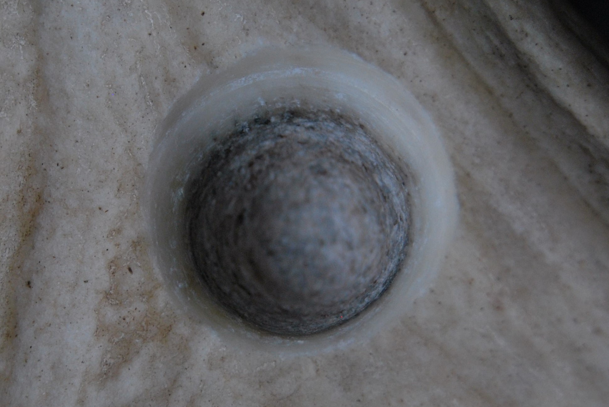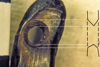 Hand-bored and bow-drilled perforations were readily distinguishable by the character of the striations observed on the surfaces, particularly of compact tissue, that had been abraded by the perforating lithic tool. Striations produced by bow drilling tended to be longer, horizontal, and parallel (See Figure 10), whereas those produced by hand boring tended to be shorter, oblique, and converging to intersecting (See Figure 11). In sum these differences amount to two quite distinct visual impressions, the striations on bow-drilled holes appearing very neat and regular, whereas those on hand-bored holes are rather messy. These differences are readily explained by the experiments. The mechanics of bow drilling are such that each single stroke of the bow, either back or forth, effects multiple full rotations of the drill bit in a single direction; when hand boring, each twist of the flint tool produces a rotation of at most around 180°. This explains the observed difference in the length of striations. Similarly, when bow drilling, an angle close to 90° is consistently maintained between the axis of perforation and the worked surface; but when hand boring, that angle is liable to vary slightly because the hand and wrist do not rotate perfectly about a fixed central axis. This explains the difference in the angle of striations.