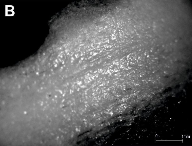 Whether or not antler was softened by soaking prior to perforation was found to have no bearing on either the shape of the hole or the length and orientation of the striations produced. It did appear that striations on soaked antler tended to be deeper, and to that extent better defined, than those on dry antler. However, the relationship did not hold uniformly; it was not true that for any given soaked perforation its striations appeared to be on average deeper than those on any given dry perforation. Furthermore, another variable was identified that may have contributed to the variation in apparent depth of striations. All antler was collected, found either shed or attached to the skulls of dead animals, in the Scottish countryside, and as such the conditions to which it had been subjected and the length of time that had elapsed between deposition and use in the experiments was in every case unknown. It must therefore be conceded that there was an unknown and possibly significant degree of variation in the state of decay of antler specimens between experiments, that this may in turn have produced further variation in how the antler responded to soaking, and that the sum of these variations may have influenced to an unknown extent the observed differences in the depth of striations. (Incidentally, the same problem does not attend the above results regarding traceological identification of hand boring and bow drilling, since those relationships were observed consistently across the sample regardless of the material perforated.) Therefore, it must be concluded that in this instance control over nuisance variables was insufficient to determine whether the decision to soak antler prior to perforating can be detected traceologically, though the possibility of a correlation with the depth of striations may repay further study by way of more rigorous experiments.