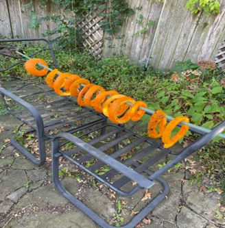 After the raw and roasted pumpkins were cut into 1 1/2in rings, they were hung from a rod and elevated off the ground with two lawn chairs outdoors in Wichita, Kansas, USA, for six days in October 2021 (See Figure 12). The raw and roasted pieces were then cut with a lithic flake and flattened by hammerstone to pressthe rings into strips. Once the rings were flattened, one mat was woven from the raw and roasted strips, respectively, in a simple basketweave pattern. The woven mats were returned outside to continue drying. The raw pumpkin mat developed mould due to the cloudy weather and high humidity in the first two weeks, but the roasted mat was not affected.3 After 25 days from the initial drying, the mat woven from the raw pumpkins was discarded due to mould; the roasted mat, however, was thoroughly dry and weighed 200g (See Figure 13). The roasted mat then hung in an interior window of the Archaeology of Food Laboratory at Wichita State University for one year, in which time it never developed mould or any signs of deterioration, though several small pieces were sampled for sensory evaluation over the year (See Figure 14). This storage period was chosen simply to observe the stability of the dried pumpkin in indoor conditions.