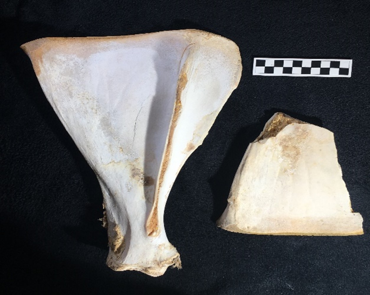 The methodology for the second bison scapula (No. 2) was altered slightly. This scapula was scored from both sides of the scapula using a simple flake tool. The scoring procedure was used until a noticeable difference in colour from the cortical surface of bone. The plantar side of the process was scored deeper than the dorsal side. A hammerstone was used to strike the plantar side to break the process. This required several strikes and left 12 fragments, shown in Figure 9. Unlike bison scapula No. 1, the glenoid cavity of the scapula was left intact. The sharpening process was started by grinding the medial end on the grinding stone; most of the grinding occurred on the ventral side but the dorsal side was also sharpened in an effort to create a cutting edge more quickly.