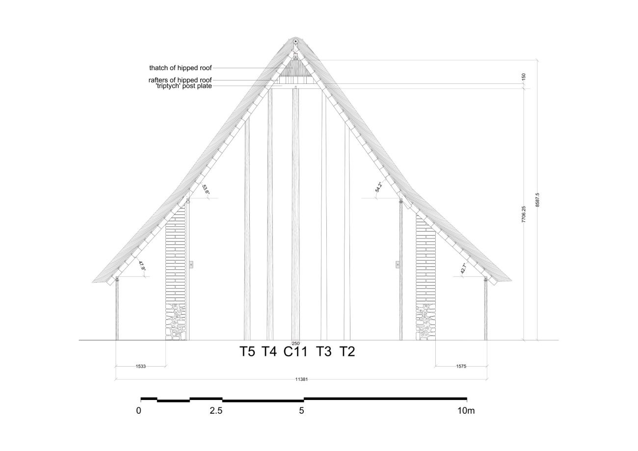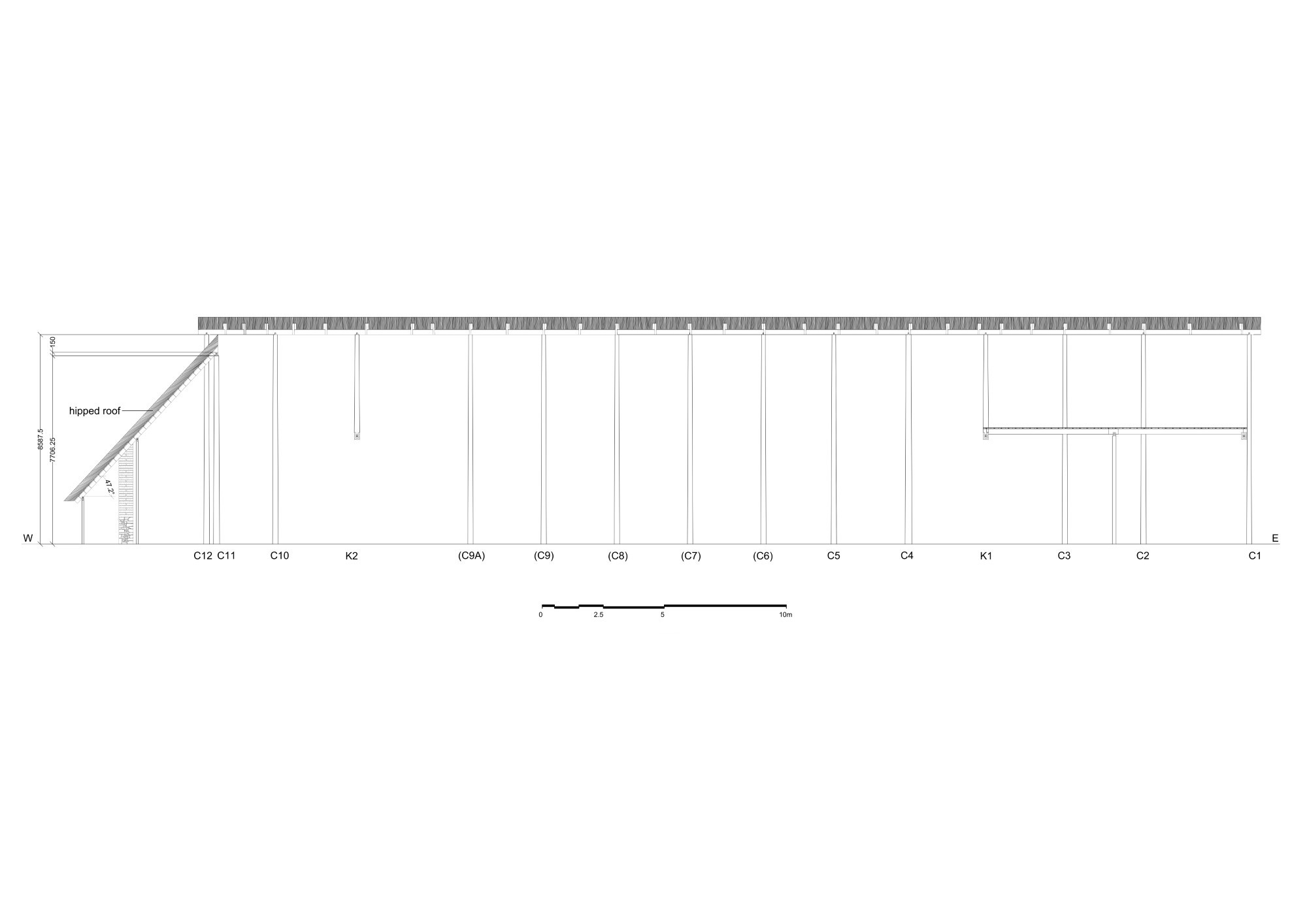 As already mentioned, in most of the building, except at the west end, the roof would have been gabled. More particularly, the 'prop-and-ridgepole' (or 'column-and-ridgepole') roof construction27 would have been used, with the ridge beams and the plates tying the building in the longitudinal direction, i.e. providing longitudinal linkage to the axial and side posts, respectively (See Figure 7).