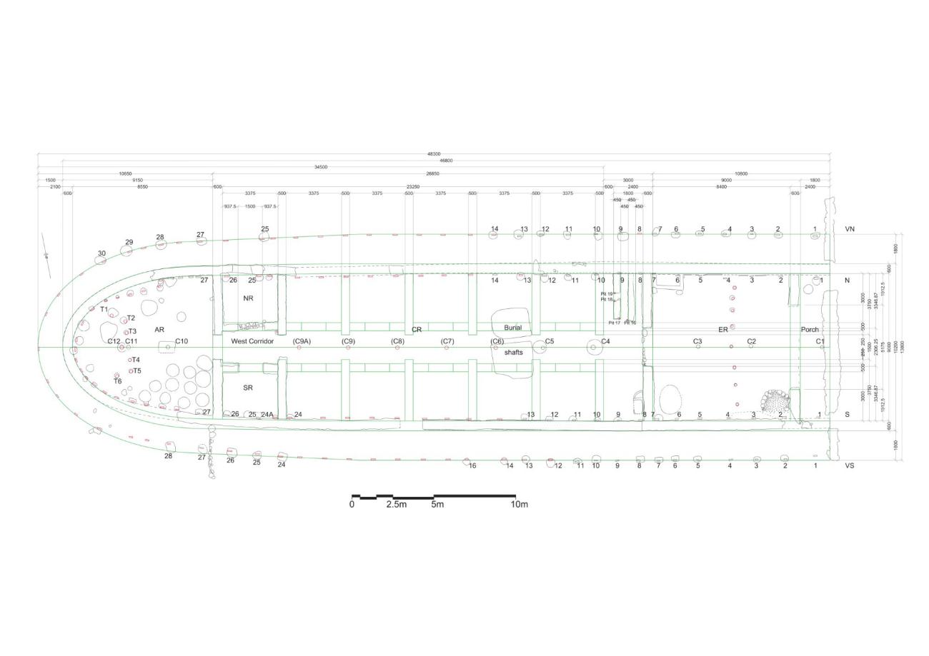 The LK-T building presents a megaron plan ending in an apse at its west end, with the entrance at the east end - an opening or 'secondary doorway' in the south wall (Popham, et al., 1993, pp. 5-6, 13, 43) is subject to interpretation (see infra). In its present state, following the damage it suffered in modern times (Popham, et al., 1993, pp. 1-3, 34), the building comprises, in succession, a shallow Porch, an East Room (ER), a Central Room (CR), two Square Rooms (SRs) - the North Room (NR) and South Room (SR) - on either side of a corridor (West Corridor), and an Apse Room (AR) (See Figure 1). Towards the middle of the building, in the CR, the rich double burial of a warrior accompanied by his female companion and four horses was found.