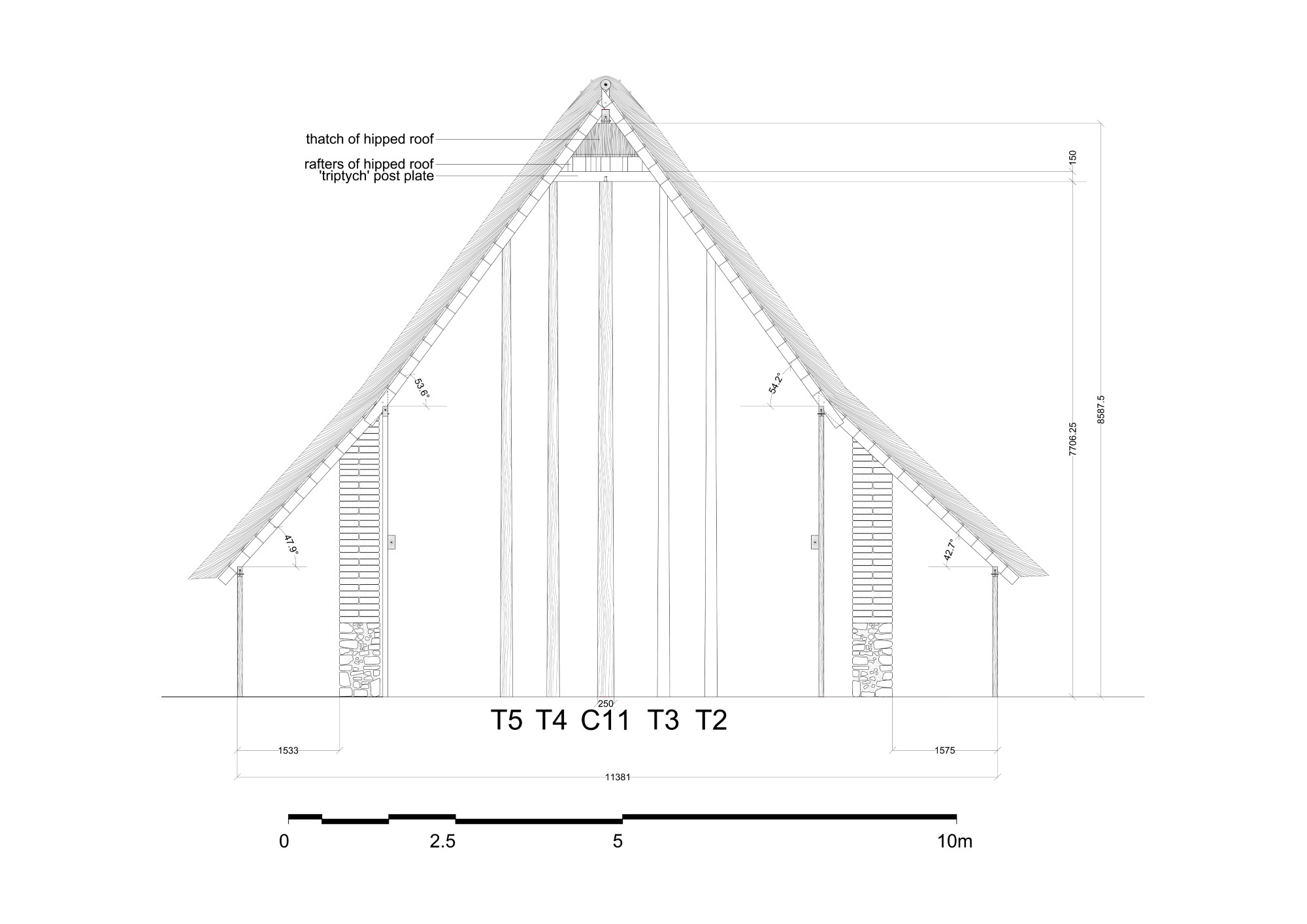 Figure 11 also depicts, in the centre, part of the different roofing arrangement that had to be adopted to cover the west half of the AR and the surrounding veranda. In this area, beyond C12, a hipped roof would have been used (See Figure 12),55 with a pitch of 47.2° and with the veranda roof built as an extension of the roof over the west half of the AR. The hipped roof would have been supported by a special, 'triptych'-like structure made of the centrally located (but not ridge-supporting) post C11 and of posts T1-T3 and T4-T7 forming two almost symmetrical, L-shaped arrangements on either side of C11 (See Figure 6: Inset A).56 All these posts would have been crowned by plates: a horizontal plate over posts T2, T3, C11, T4 and T5 (See also Figure 11); two cranked plates respectively over posts T1-T2 and T5-T6; and perhaps also another horizontal plate over posts T1 and T6 for the bracing of the 'triptych'57 (not shown on Figure 6). On the plates of the 'triptych' would have rested the upper ends of the interior rafters of the hipped roof in a fan-shaped arrangement with their lower ends resting on the plates above the wall posts; the latter would also have received the rafters of the veranda roof (See Figure 6: Inset A and Figure 12). The plates for the wall- and veranda posts in the apsidal part of the building would probably be curved (rather than straight) timbers.58, 59 Adopting a hipped roof over the (west end of the) apse would have been yet another method - besides embedding the posts and adding verandas acting as aisles (supra) - used by the LK-T carpenters to ensure the structural balance of the building, since this type of roof offers the advantage of resisting high winds.60