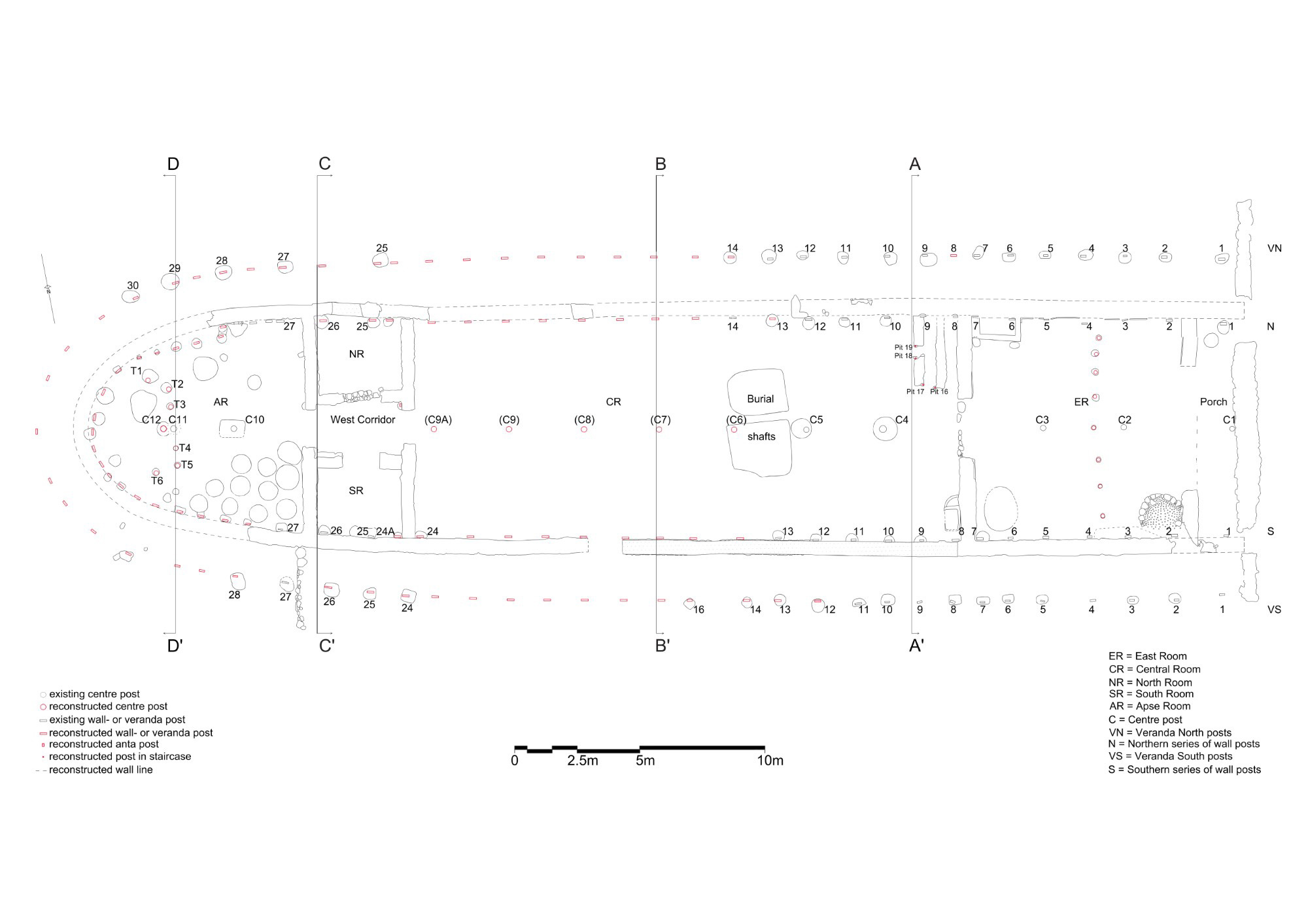 A prominent feature of the building, on which we will focus, is the large number of timber posts. These timber posts, after decaying, left clear imprints in the fill of the specially dug pits and, in some cases, their wood residue was preserved well above floor level. Thus, a series of posts of round cross-section (average diameter: 0.222 m)1 were set on the long axis of the building (henceforth, centre posts) dividing it into two aisles. In addition, a double series of posts of rectangular cross-section (average width: 0.22 m; average thickness: 0.072 m) ran (a) all along the inner face of the exterior walls (henceforth, wall posts) and (b) parallel with but at some distance from the west, north and south walls of the building forming a veranda (henceforth, veranda posts). This veranda is a forerunner of the peristyle (or pteron, peristasis) of Greek temples and the earliest attested example. Finally, there is a series of post pits across the ER and another across the AR.
