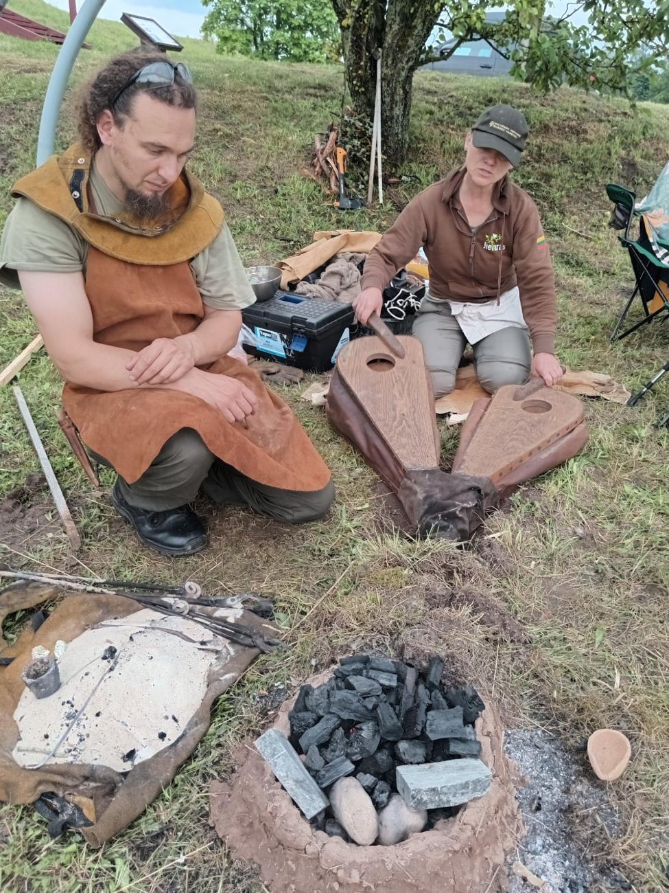 The team in charge of the weekend event included the author, Dr Agnė Čivilytė, and Dr Gvidas Slah. Dr Čivilytė is an archaeologist with the Lithuanian Institute of History. In 2016 she worked on the excavation of the Late Bronze Age hillfort of Garniai 1, just 5 km away from Daugailiai village, and worked on Antilgė in 2017. Dr Slah is a reenactor specializing in ancient metals and stonework at the Lithuanian Academy of Arts, Telšiai faculty. The goal for the event was two-fold: to provide an interpretive archaeological experience for visitors who came for the day-long festival, and to take environmental samples for a pilot programme exploring the environmental effects of small-scale metalworking events.