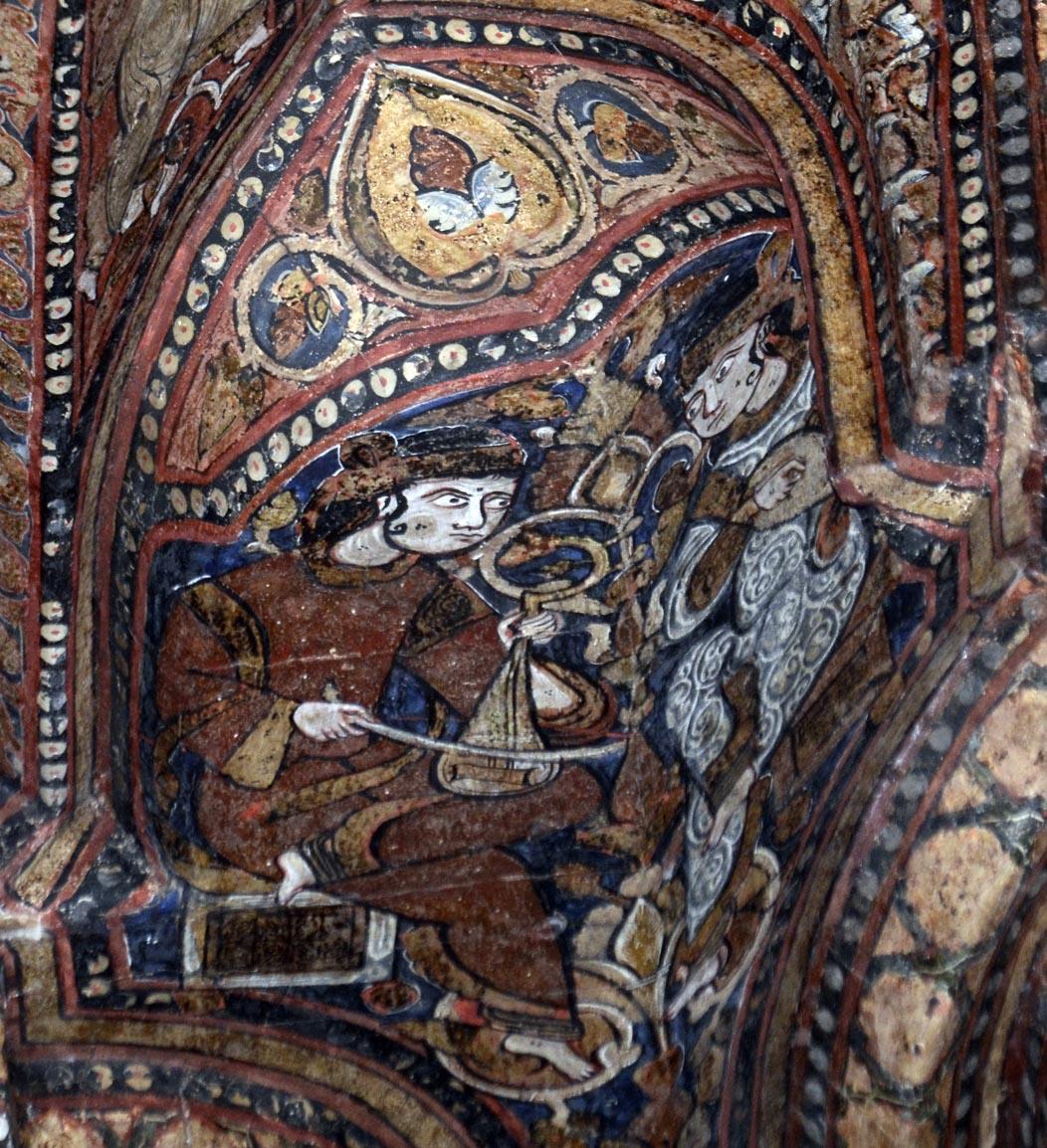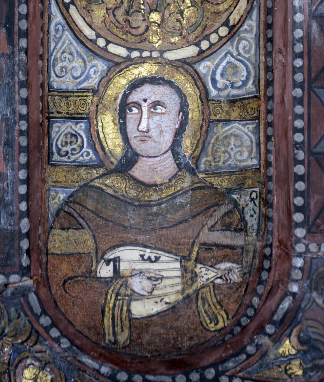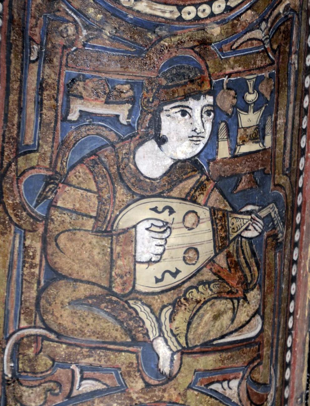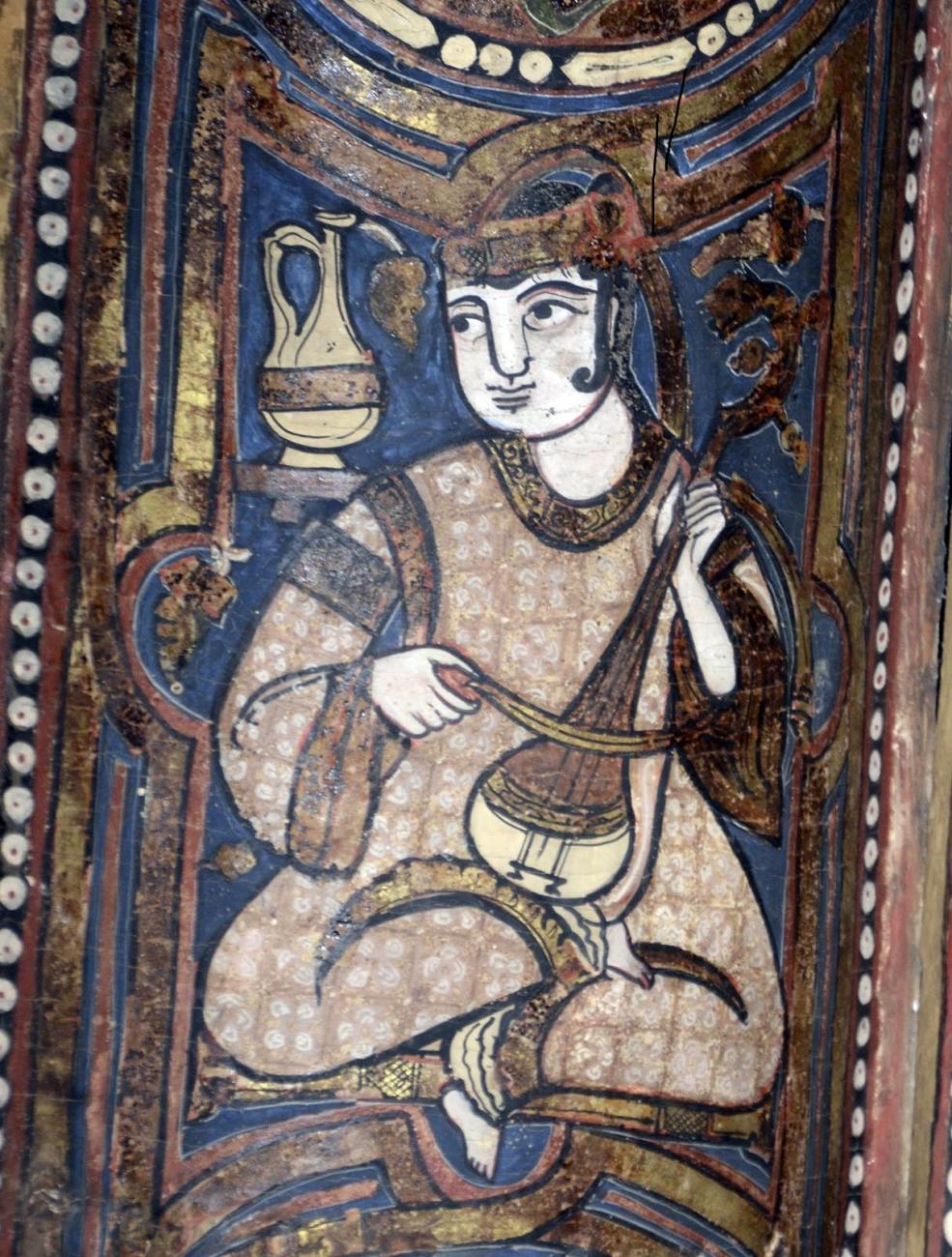 Some of the paintings are visible today on the wall at the entrance of the Museum of the Cathedral, but they do not depict human figures. The others, documented photographically in a single publication (Carapezza, 1994), are located among the beams of the central ceiling of the church. The conservation state of the paintings, which seem to have never undergone restoration, appears mediocre. The depicted instruments are large four-course lutes, small three-course lutes almost identical to those seen in the Palatine Chapel, plus a peculiar lute with a horseshoe-shaped body. There are also depictions of mermaids and dancers. It is suspected that these fragments belonged to a previous building, integrated into the Christian church, which would have allowed them to survive, relegated to an inaccessible location. It would be desirable to place them in the Museum, after adequate conservation and restoration work.