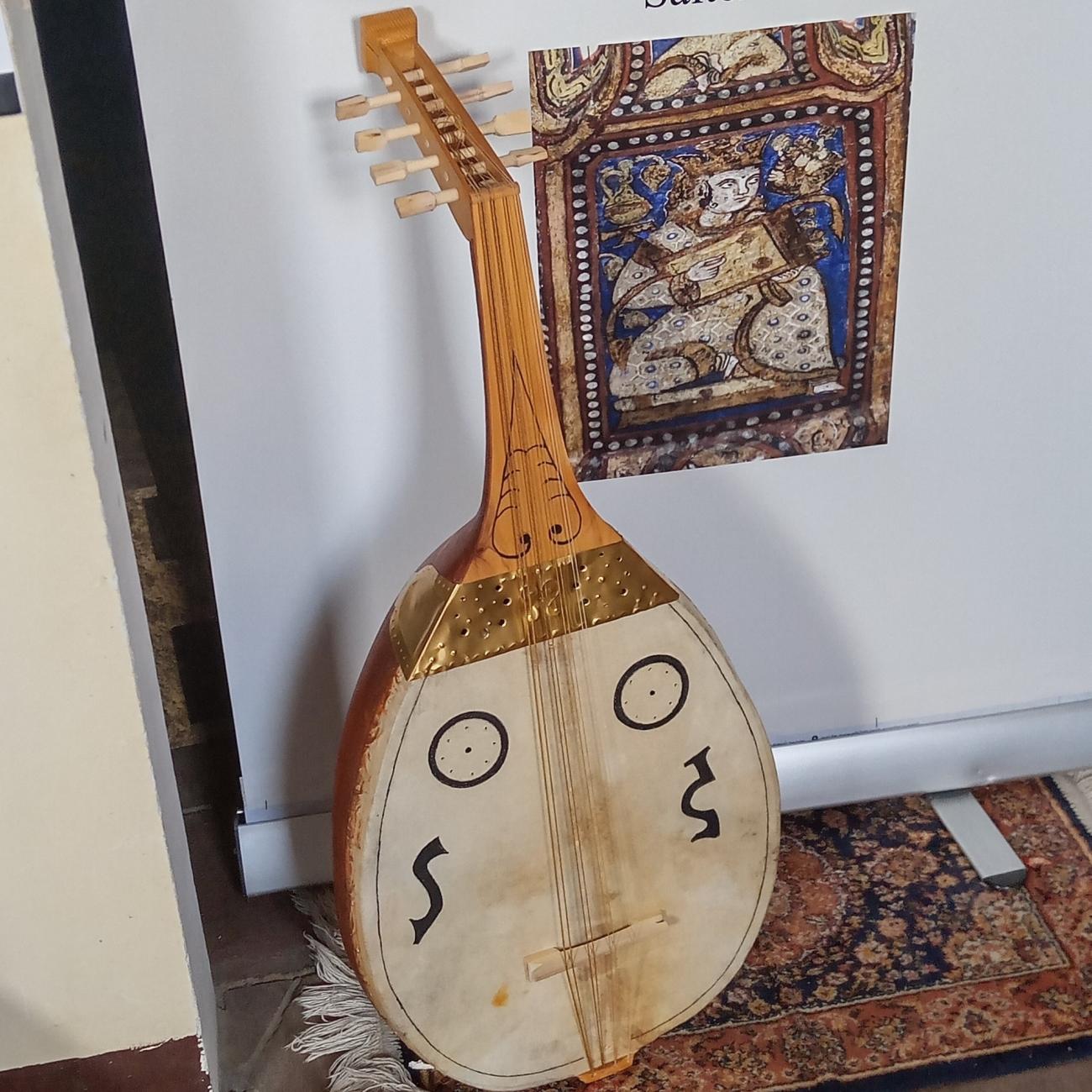 The sole analysis of the figures from Palermo and Cefalù would not be sufficient to fully identify the musical instruments or authorize credible reconstruction work. Fortunately, we have other sources of information and comparison on this subject, which can encourage us to undertake our complex and, in some points, uncertain task. We can rely on the testimonies of theorists such as al-Kindī (9th century) and al-Fārābi (10th century), and about musicians like Ziryāb (9th century). The most important studies I have consulted in this regard are those of Righini (1983), Guettat (2000) and Paniagua (2018). From these works, a fairly comprehensive profile of the history of the medieval lute (ūd) can be derived. We know from various sources the tunings, the materials of the strings and plectra, and we have indications regarding the construction of the instruments. From the analysis conducted in (Paniagua, 2018, pp.15-24), it is evident that the lute originated in Persia under the name of barbat and is a monoxylous instrument with a leather or wooden soundboard and four single strings (like the current Berber loutar ). It was brought by the Arabs to Mecca, where the strings became four double and the soundboard wooden. Finally, Ziryāb is credited with the idea of constructing the ribbed body and adopting the plectrum made from a bird's feather. In this form, the instrument spread through the Maghreb to Andalusia. Additionally, Paniagua (2018) offers an interesting photographic survey presenting 180 depictions of the lute from the 7th to the 15th century, grouped by geographic area. Observing the 18 depictions from the 10th to the early 13th centuries from Persia, Syria, Egypt, and Spain and comparing them with the nine images from the Palatine Chapel of Palermo, the uniqueness of the Sicilian lutes is immediately noticeable. They feature a transverse band between the neck and the soundboard, visible only in one non-Sicilian example from Egypt. There is only one other possible comparison with the Sicilian instruments: the miniatures from the Cantigas de Santa Maria (circa 1284), which, although at least a century and a half later, depict lutes and rabābs. The lutes are of similar size to the Sicilian ones, showing five pairs of strings and multiple decorations (perforations?) on the soundboard. One of the two-string rabābs is similar in overall shape to one in the Palatine Chapel, but its pegbox is like that of the lutes and not falciform like the Sicilian ones.